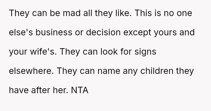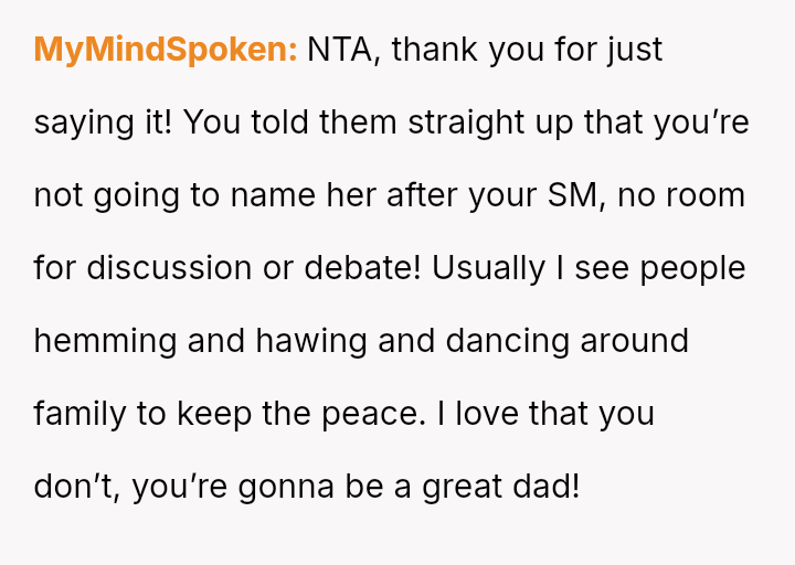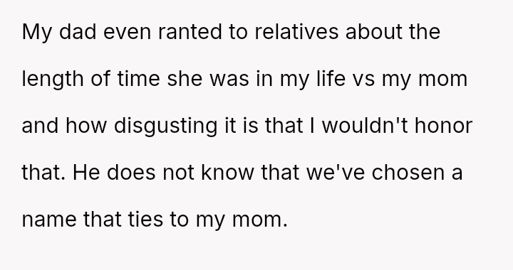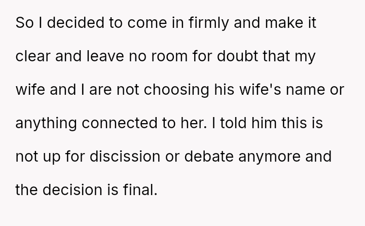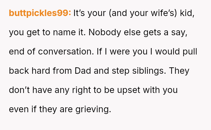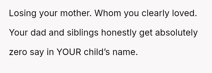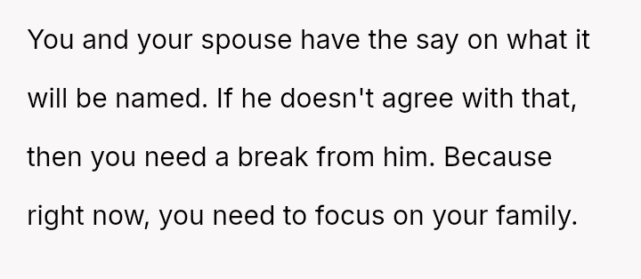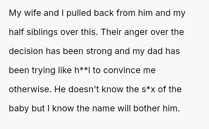 As the birth approaches, the OP has firmly stated that the naming decision is final and not open for further discussion, leading to increased anger and criticism from his father and half-siblings, making the OP question if he was wrong to be so absolute in his rejection.