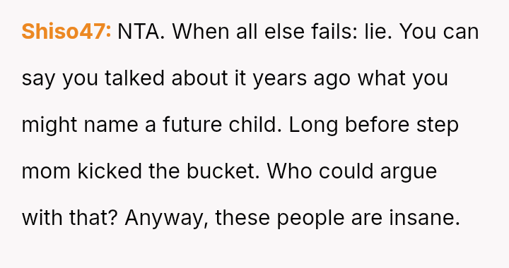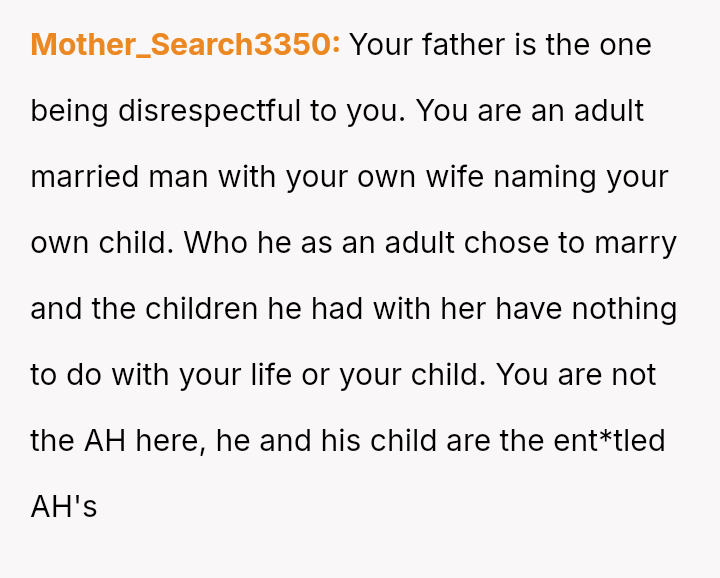 The debate centers on whether the OP's absolute firmness in rejecting the requested name, even with a privately chosen alternative honoring his biological mother, was an overreaction that unnecessarily escalated family conflict, or if the father's expectation const*tuted an inappropriate imposition on the OP's family unit.