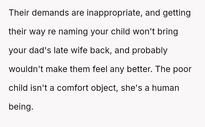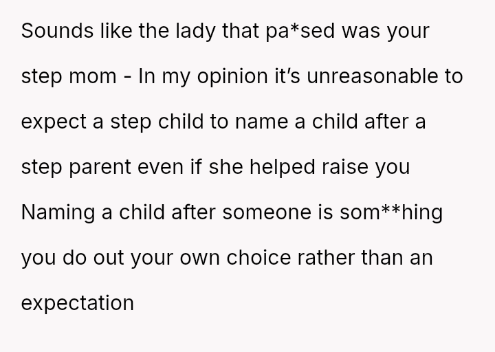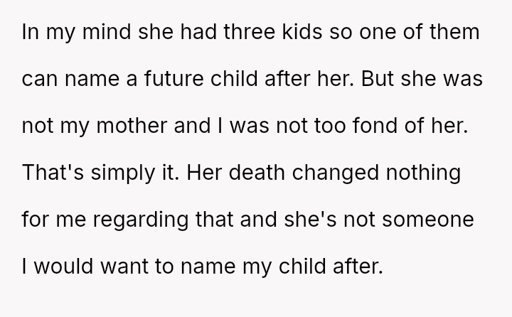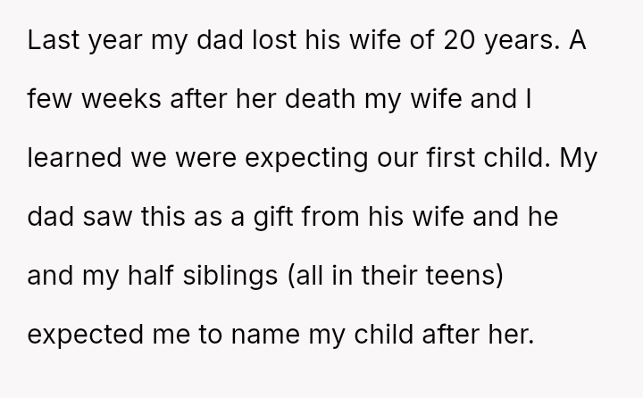 Following this news, the OP's father and his teenage half-siblings strongly expected the OP to name the new baby after the deceased stepmother, either as a first or middle name.