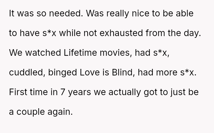 After seven years of relentless exhaustion and parenting demands, a couple finally carves out a rare weekend just for themselves—a fleeting chance to reconnect, to remember the intimacy and joy that once defined their relationship.