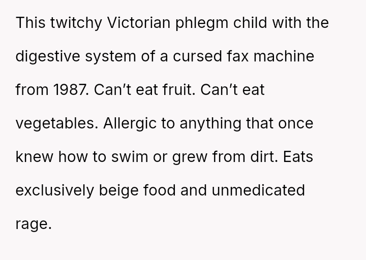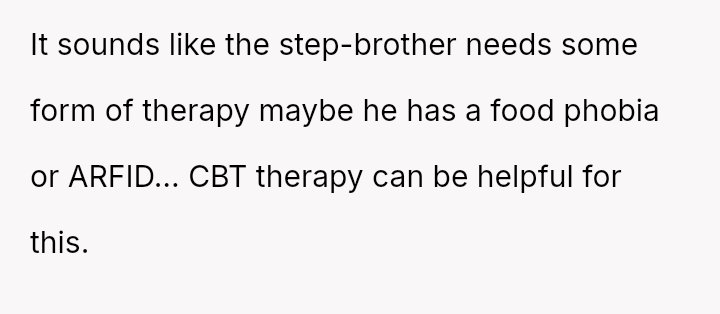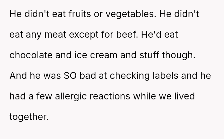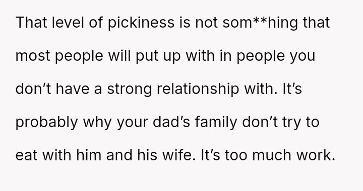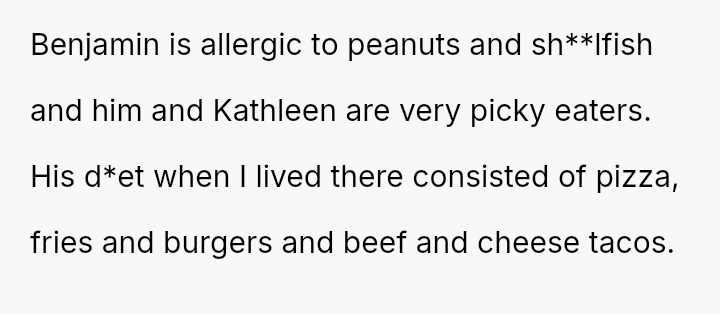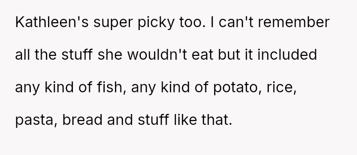 His stepmother, Kathleen, is also very particular, avoiding foods like fish, potatoes, rice, pasta, and bread.