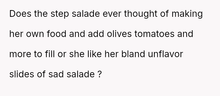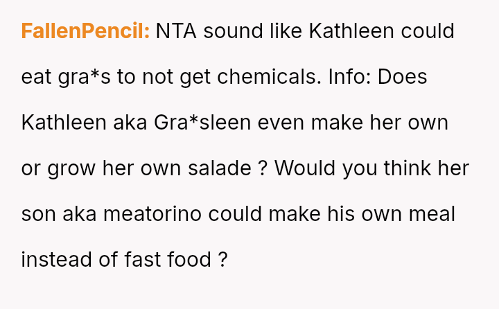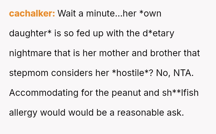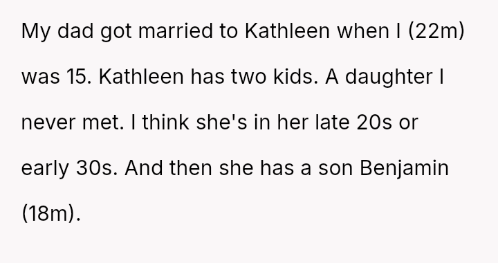 The 22-year-old male poster (OP) describes the complicated eating habits of his stepmother, Kathleen, and her son, Benjamin (18m), who live with his father.