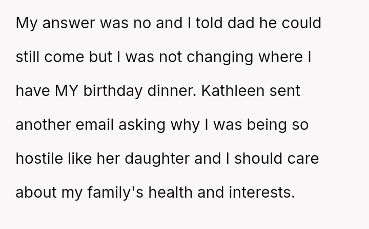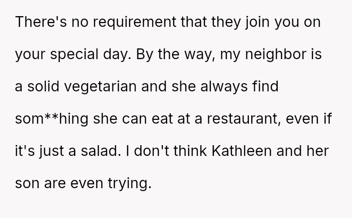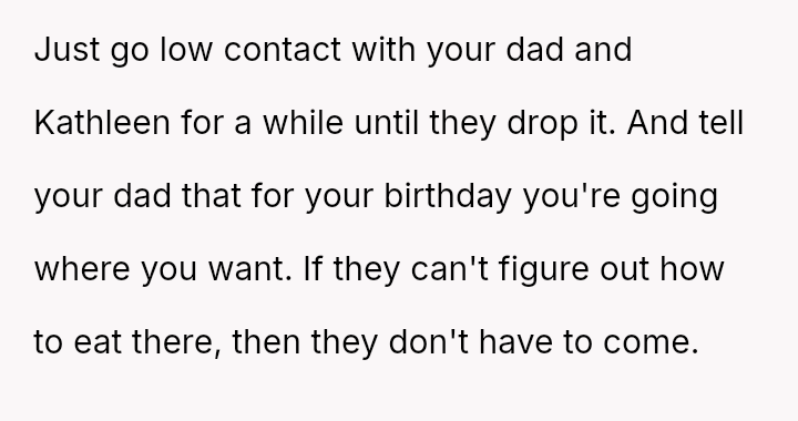 The OP feels frustrated by years of having his celebrations dictated by others' extreme d*etary limitations and reacted by drawing a firm boundary for his own special occasion, resulting in conflict with his father and Kathleen.