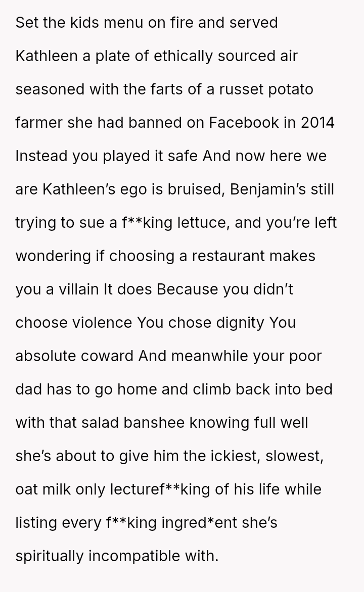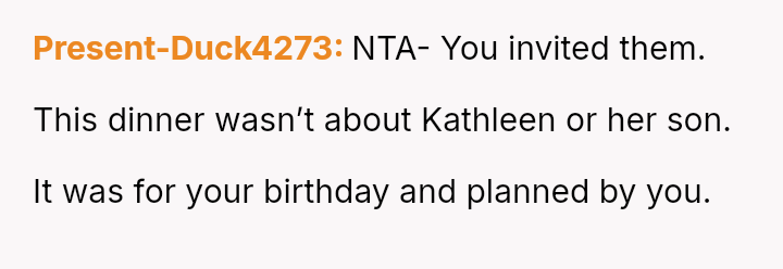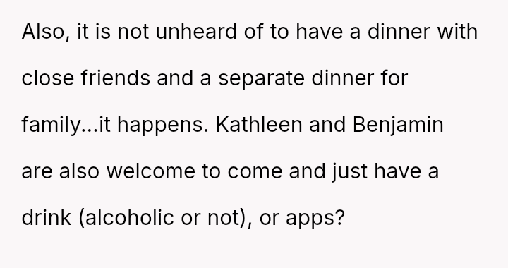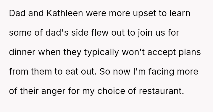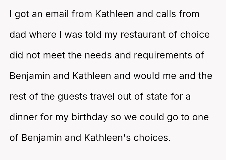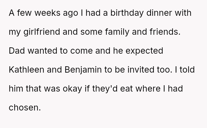 When the OP planned his recent birthday dinner at a restaurant of his choice, his father insisted that Kathleen and Benjamin be invited.