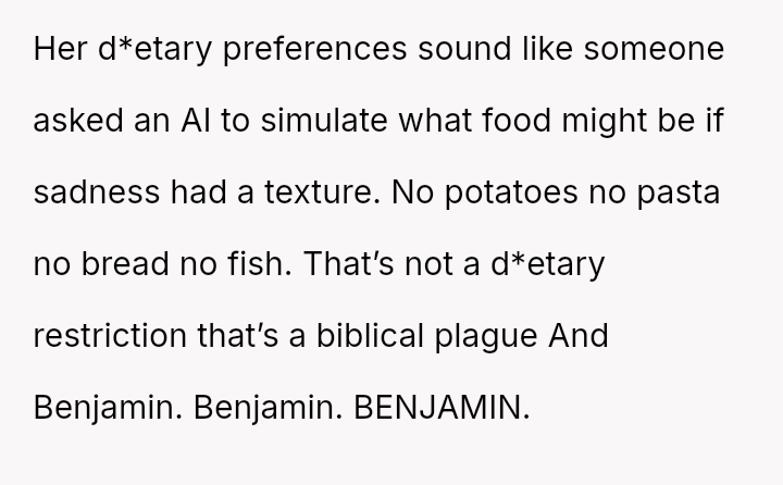 Benjamin has severe allergies to peanuts and sh**lfish and is extremely picky, with a d*et consisting mainly of pizza, fries, burgers, and beef tacos, avoiding most fruits, vegetables, and other meats.