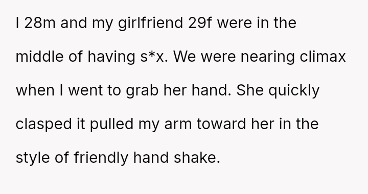 The narrator, a 28-year-old male, and his 29-year-old girlfriend were engaged in s*xual activity. As they approached climax, the narrator reached for his girlfriend's hand.