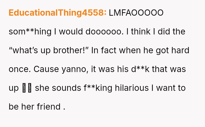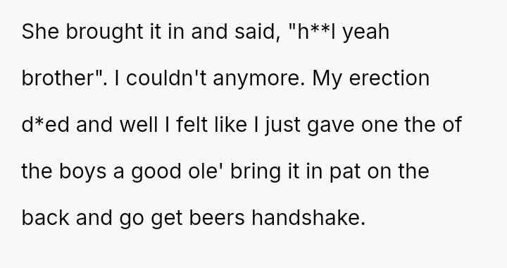She unexpectedly grasped his hand and pulled it toward her in a movement resembling a friendly handshake, saying, "h**l yeah brother." This action immediately stopped the narrator's arousal, causing his erection to subside, leaving him feeling as though he had just shared a casual, platonic gesture with a friend. The narrator is now seeking an outlet to discuss this confusing and deflating experience.