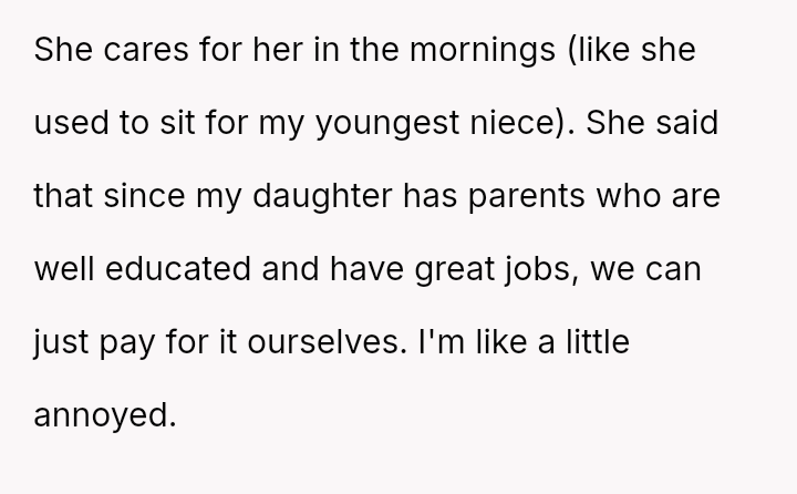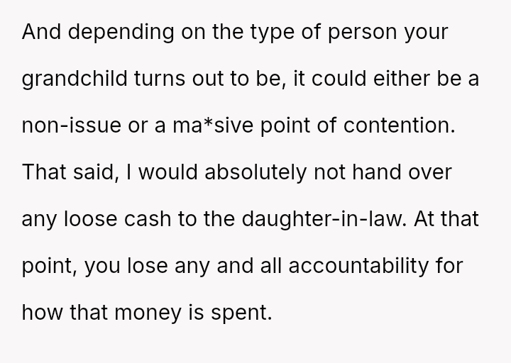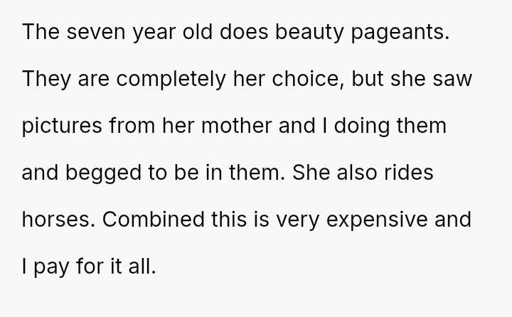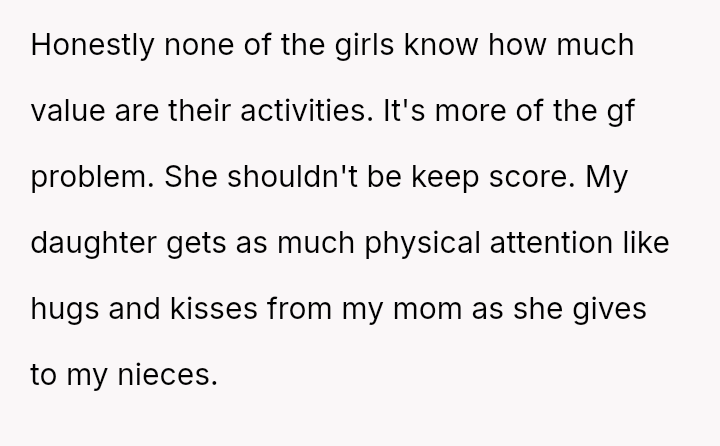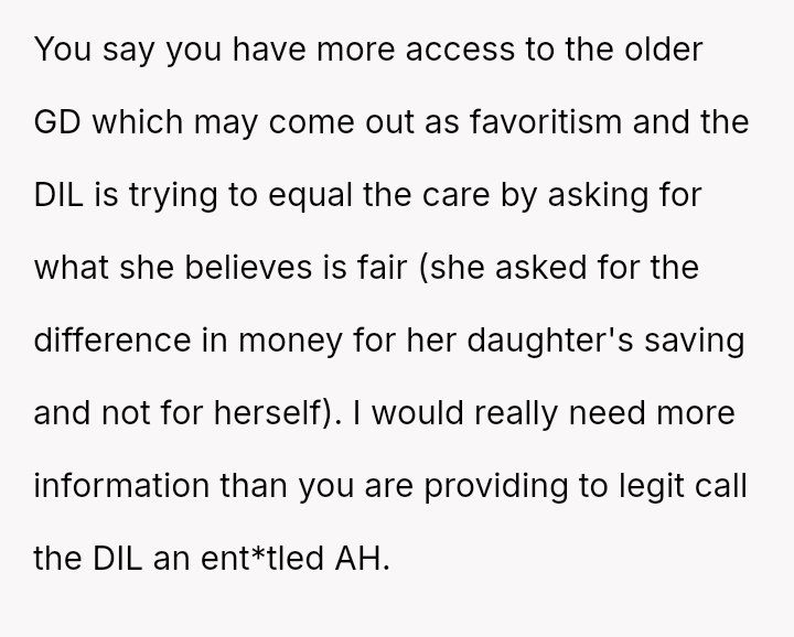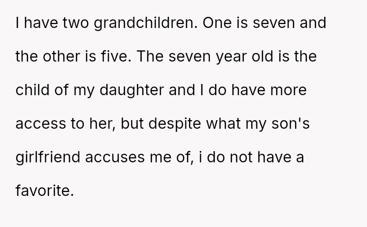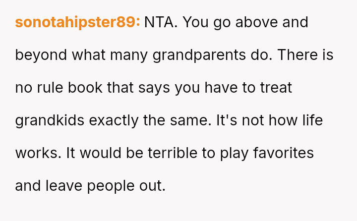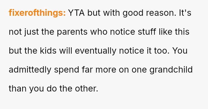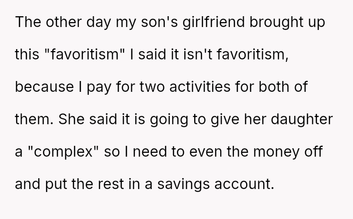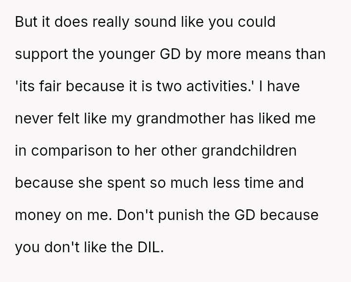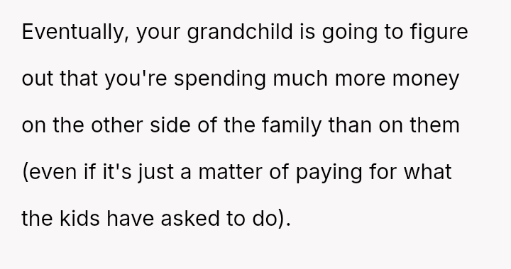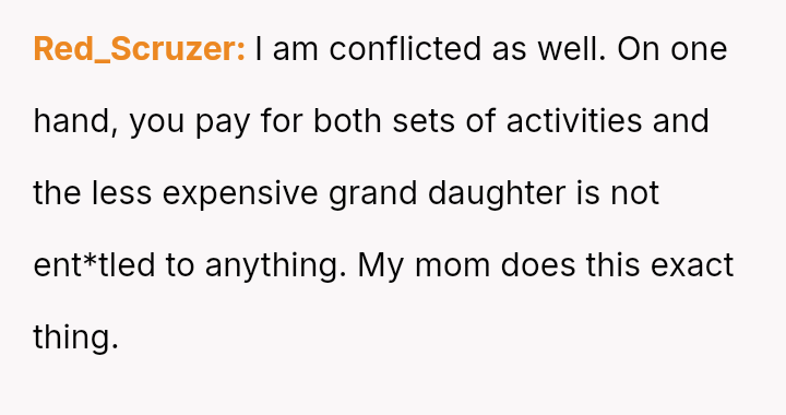The grandparent is facing accusations of favoritism due to the significant financial support provided for one grandchild's expensive extracurricular activities, which conflicts directly with the standards set by the other grandchild's mother.