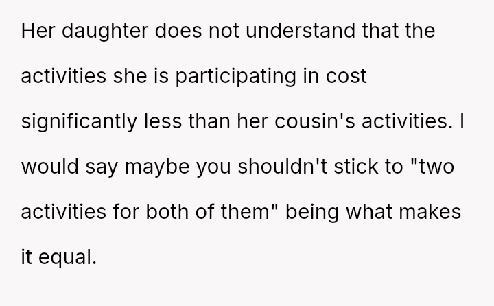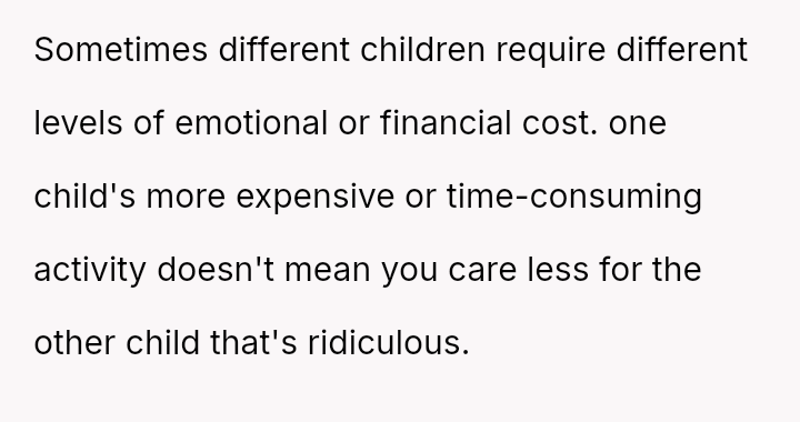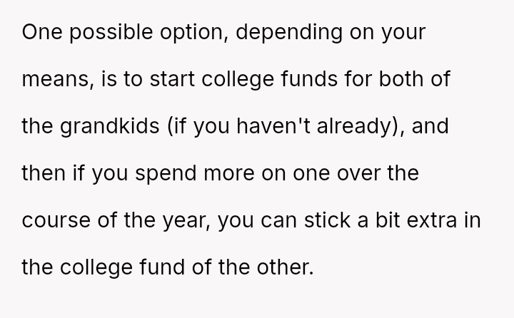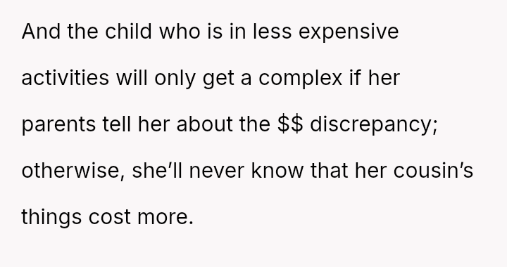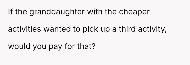 Is the grandparent responsible for matching the monetary value of activities for both grandchildren, or does their willingness to support the interests of each child independently justify their current financial contributions, regardless of the cost difference?