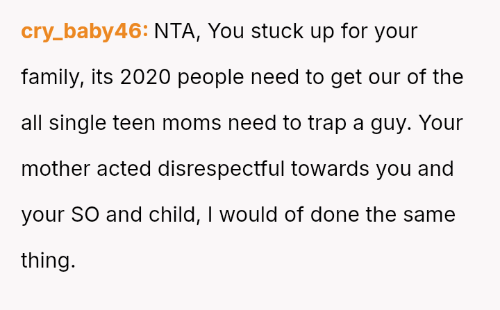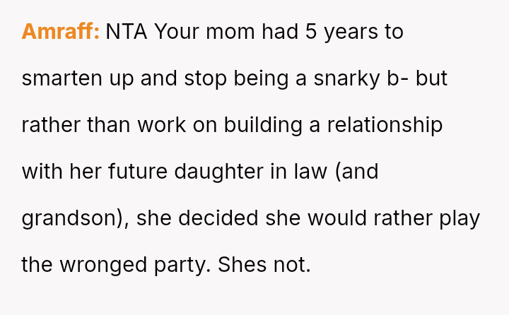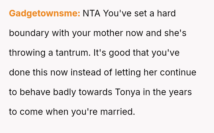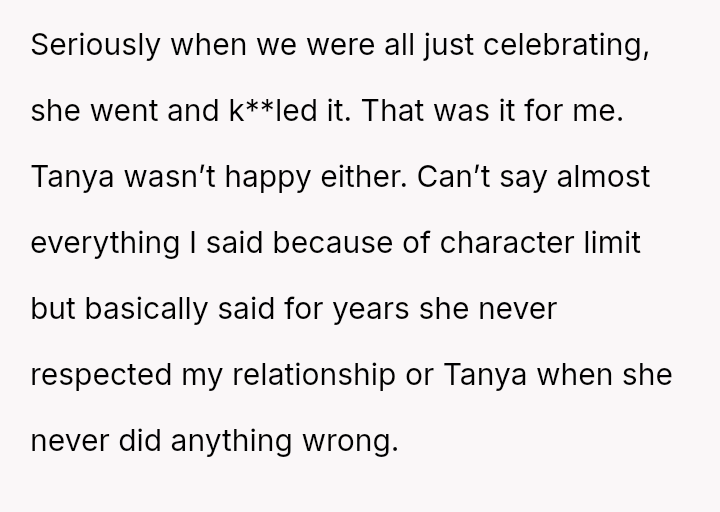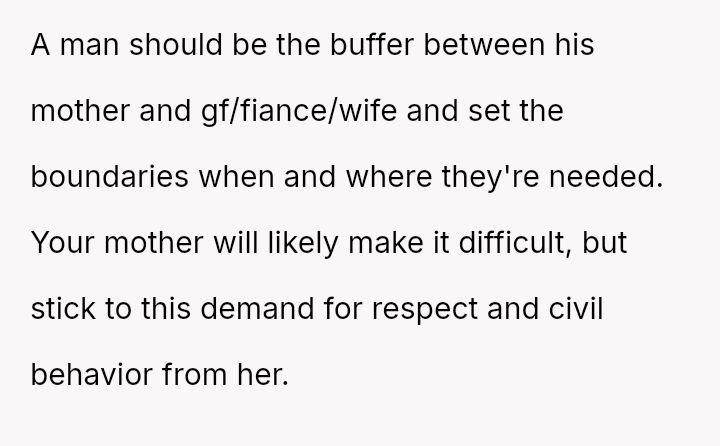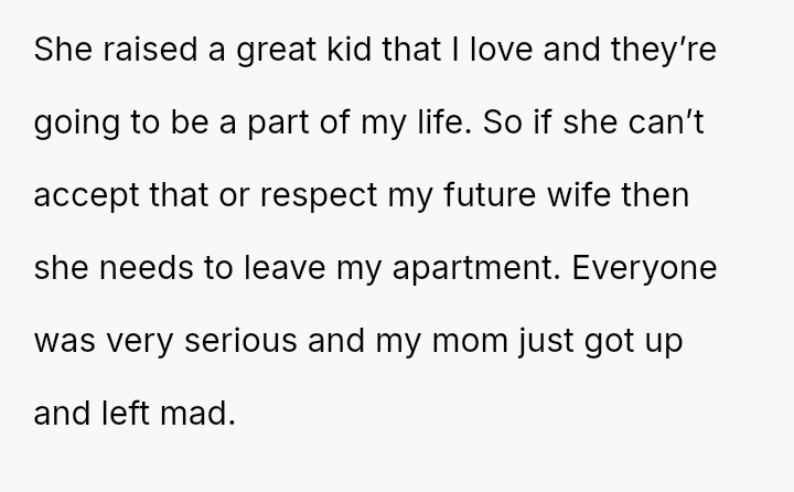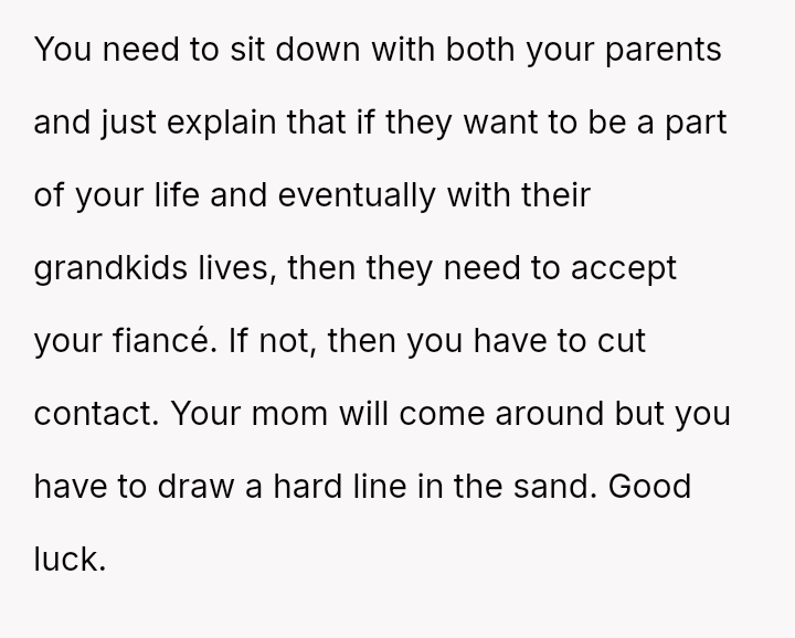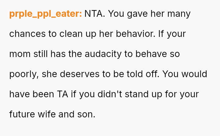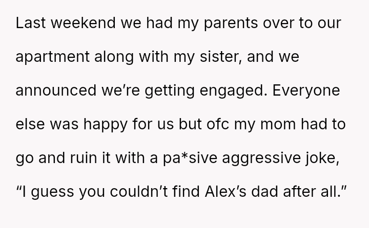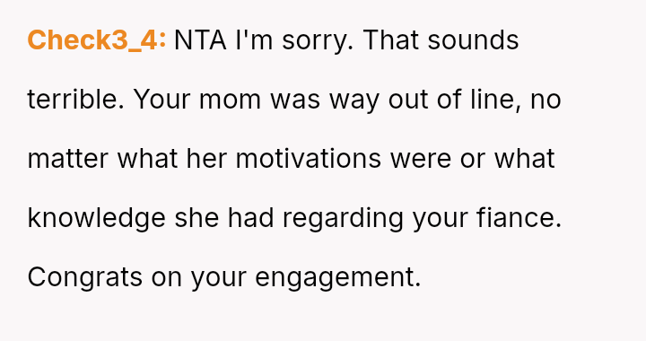 The original poster (OP) reached a breaking point after years of his mother's disrespectful comments toward his fiancée, culminating in a highly inappropriate remark during their engagement announcement.