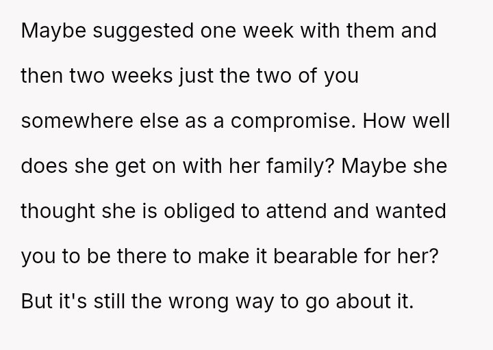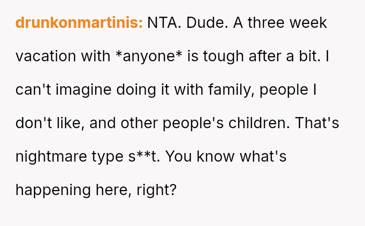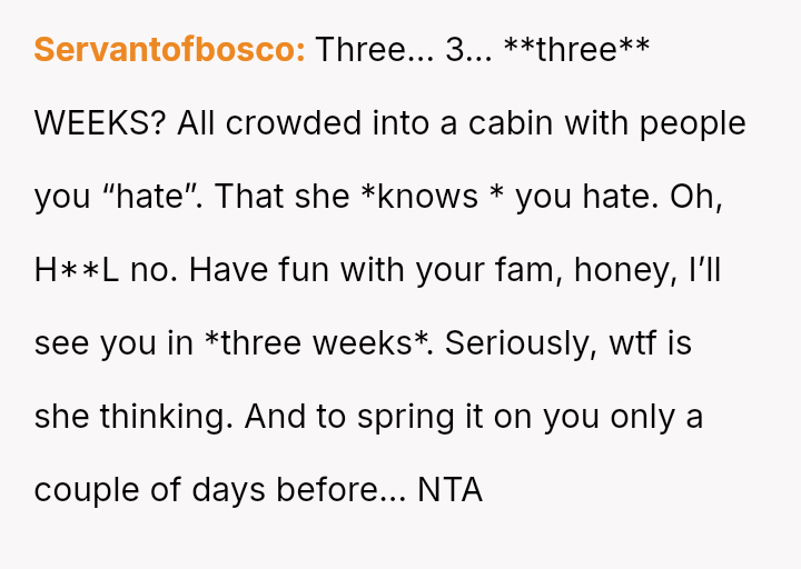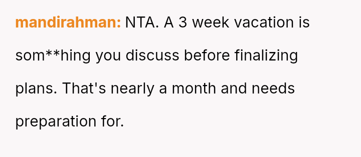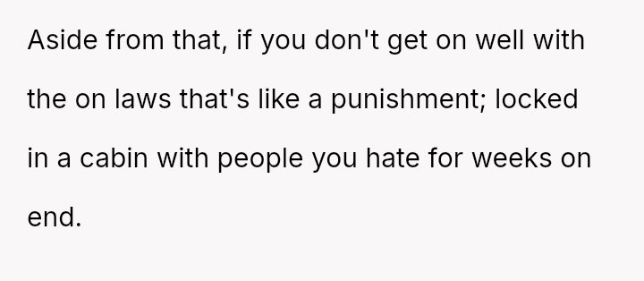 Is the husband justified in prioritizing his mental well-being and desired vacation experience over spending three weeks with in-laws he finds toxic, even if it means upsetting his wife who organized the surprise?