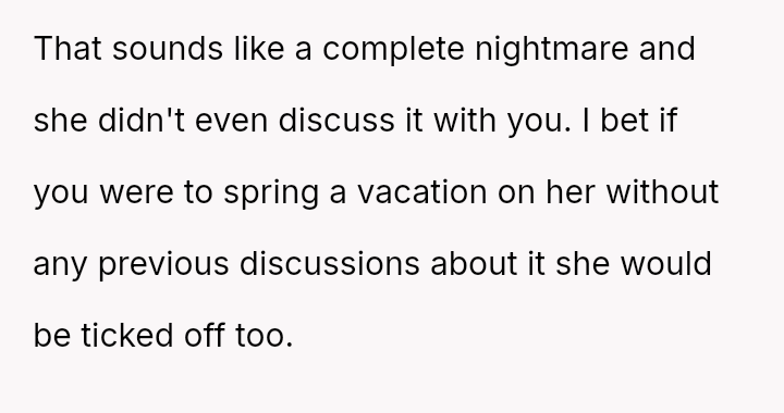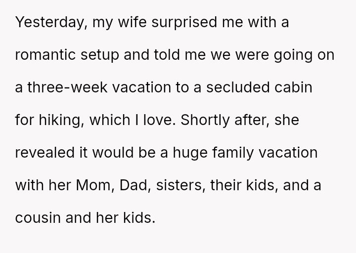 The husband strongly desired a peaceful, nature-focused vacation after a stressful work period, leading him to feel deeply disappointed and resistant when his wife turned the surprise trip into an extended family gathering involving relatives he intensely dislikes.