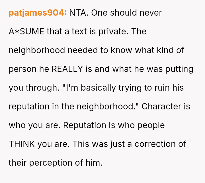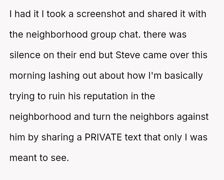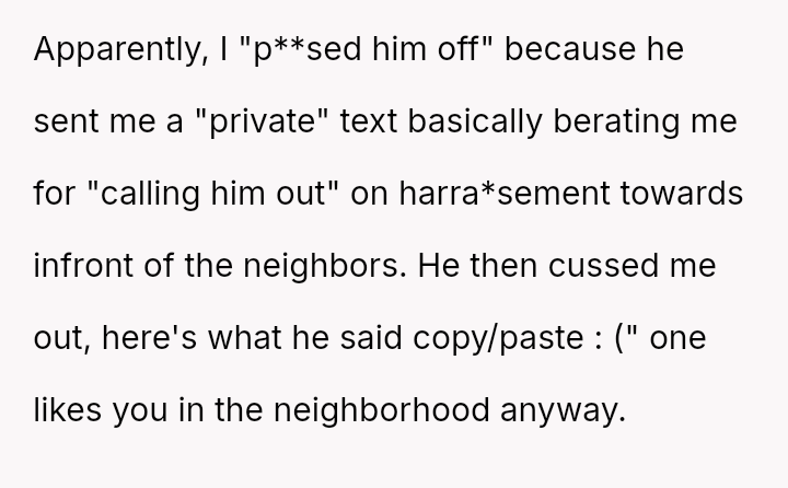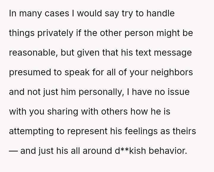 Was the OP justified in sharing the neighbor's private, aggressive text message publicly to defend themselves against ongoing h***ssment, or did this action cross an ethical line by intentionally damaging the neighbor's reputation within the community?