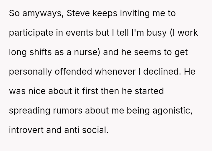 Steve reacted to the OP's firm boundary setting with escalating h***ssment, culminating in a highly aggressive private message.