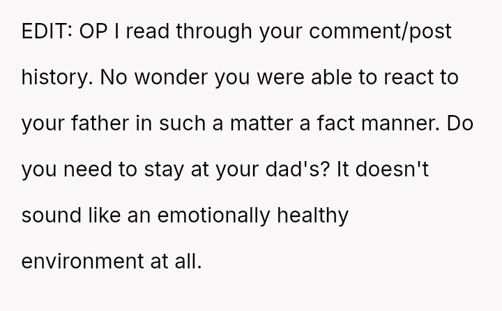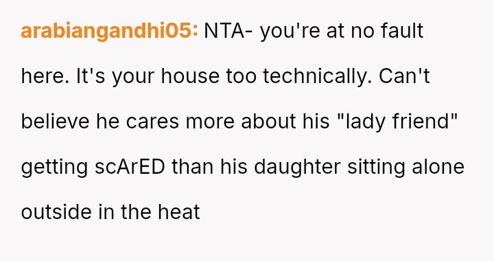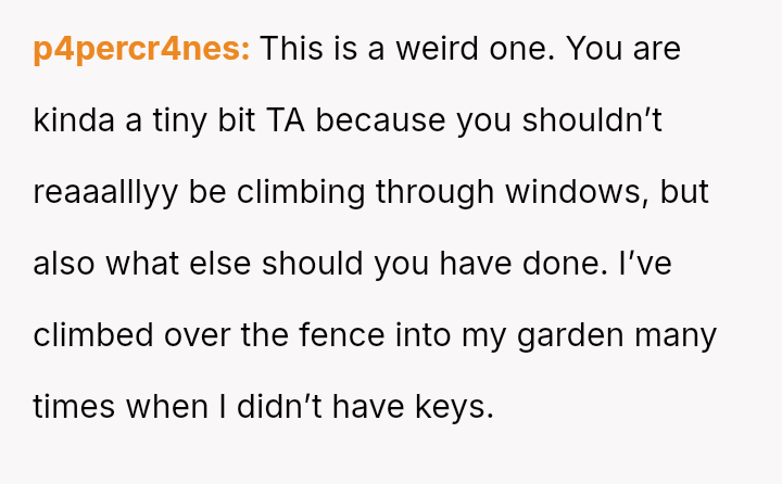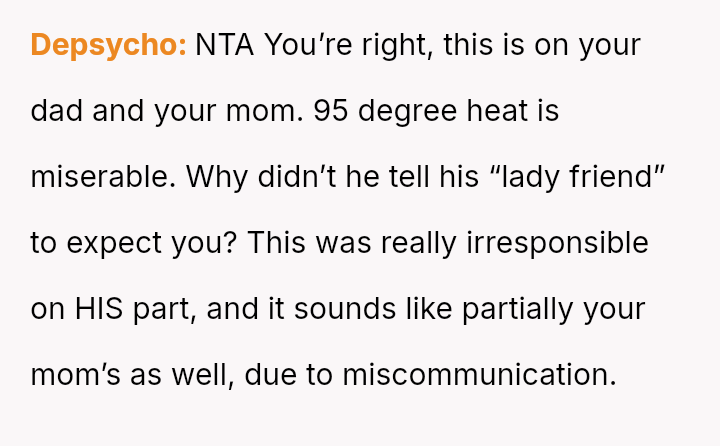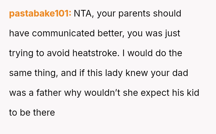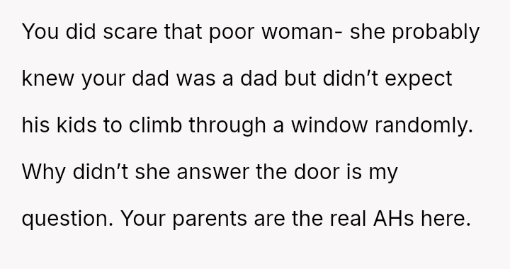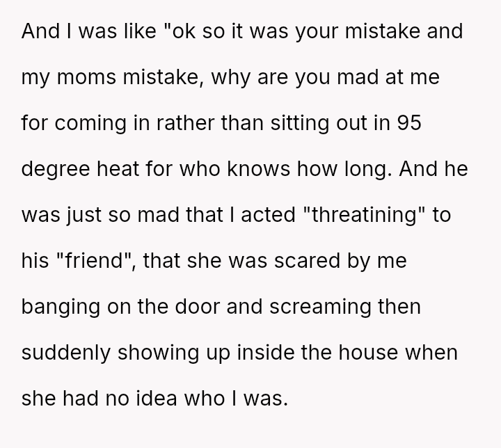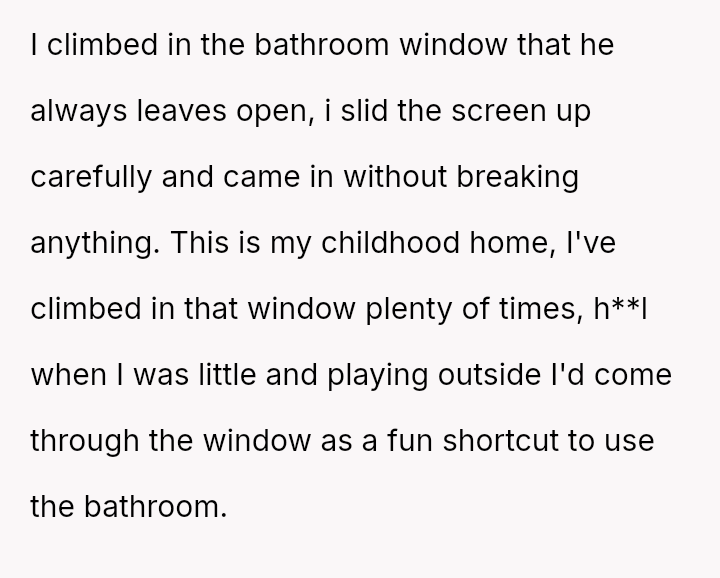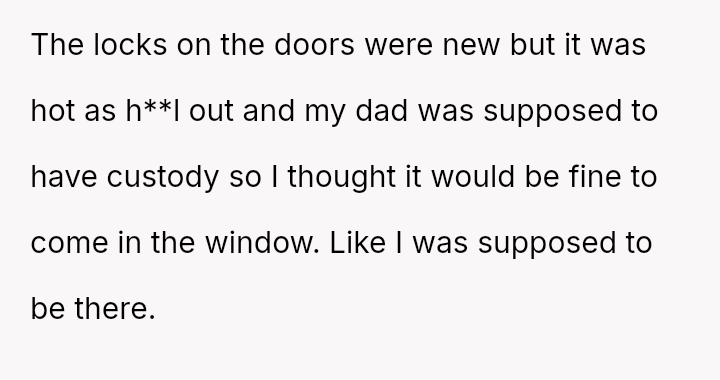 The original poster (OP) faced a difficult situation involving miscommunication about custody exchange times and extreme heat, leading them to enter their father's home via an unlocked window for safety.