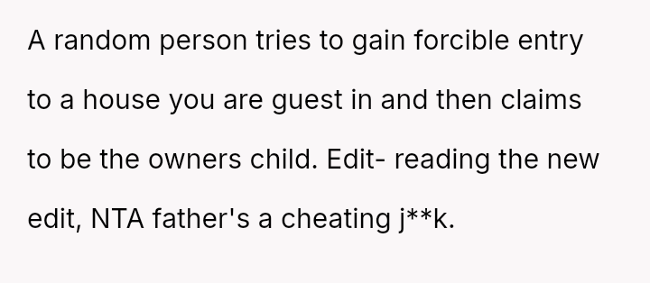 Should the OP be held accountable for entering the house using a known entry point when facing unsafe conditions, or does the father bear primary responsibility for failing to ensure access and for introducing an unexpected guest during a custody transfer window?