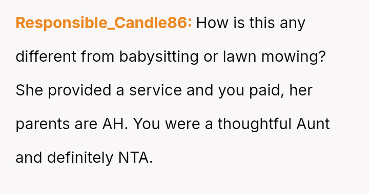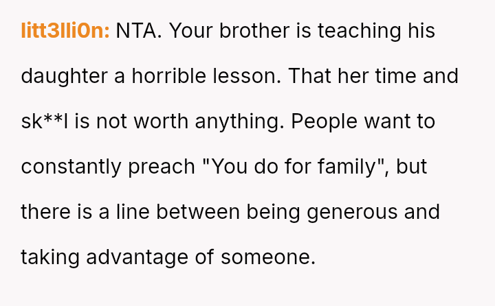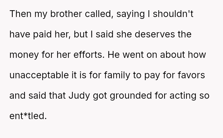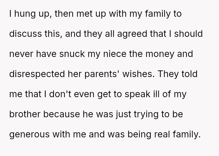 This action led to the niece being punished and the OP facing unanimous disapproval from extended family members who prioritized the parents' authority and the notion of free family favors.