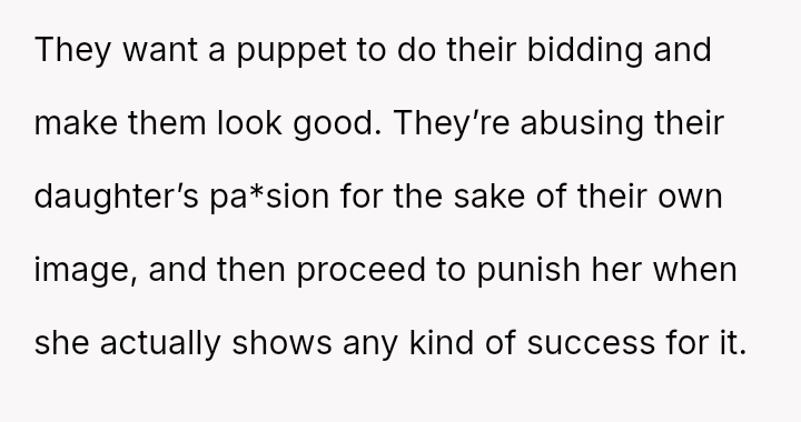 But the very people who should have supported her—her parents—saw her dream as a distraction, demanding she give away her talent for free, draining her hope and resources.