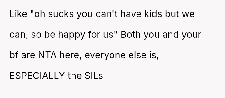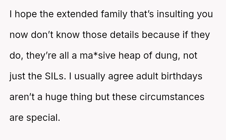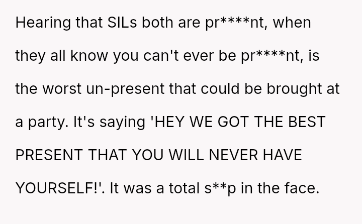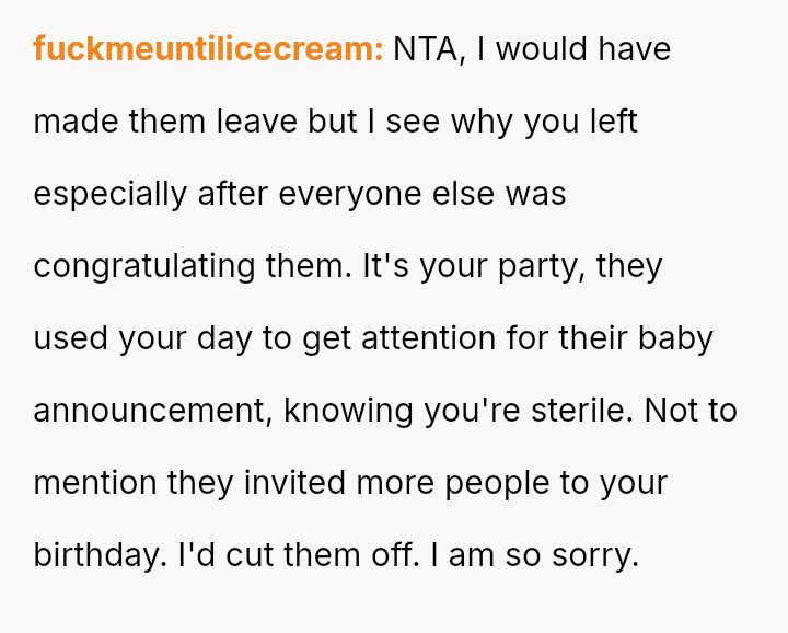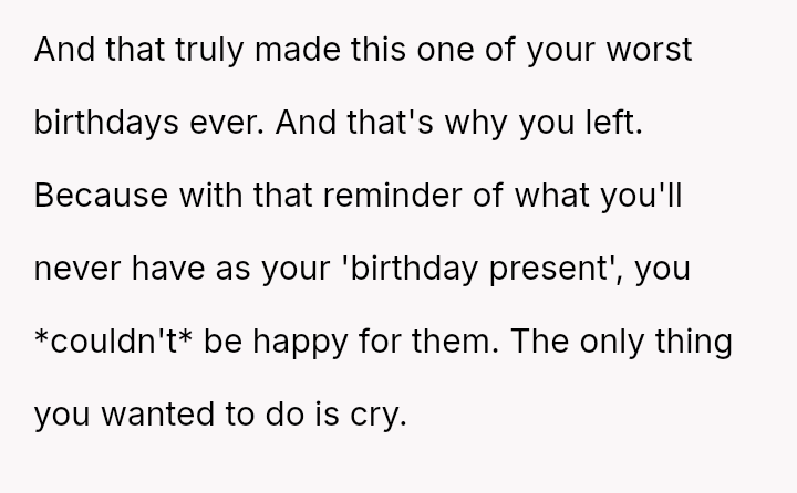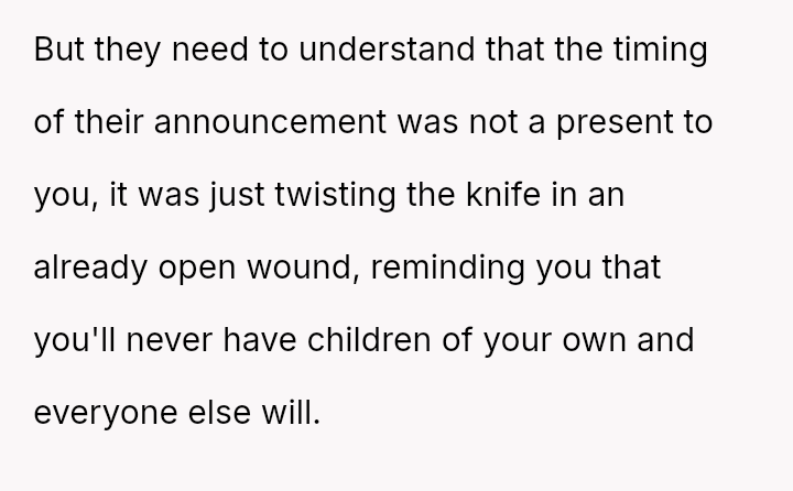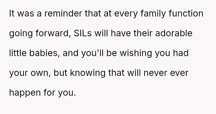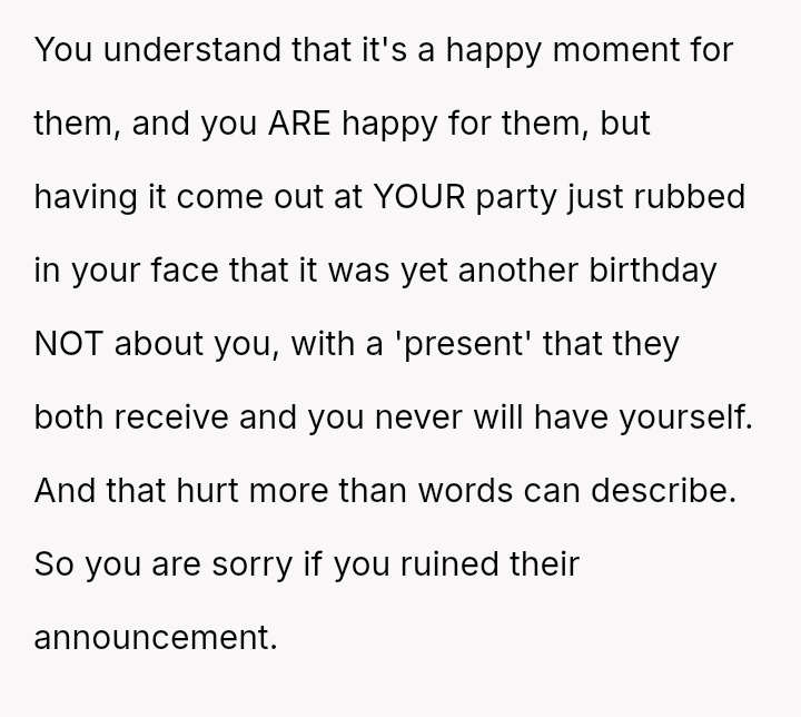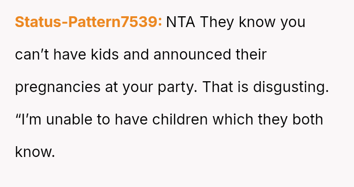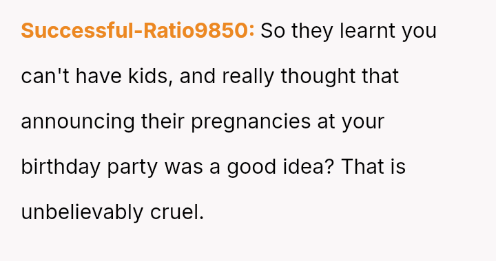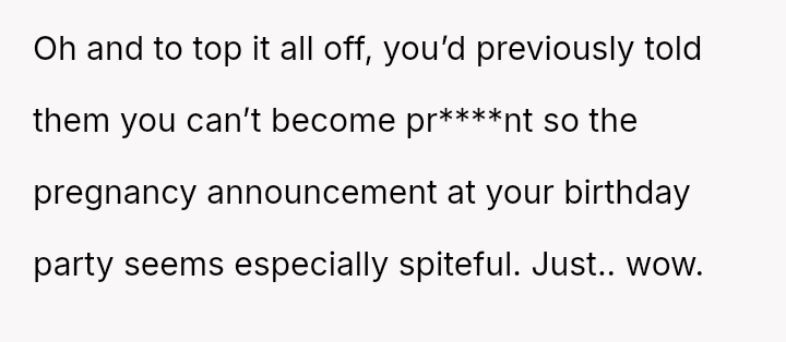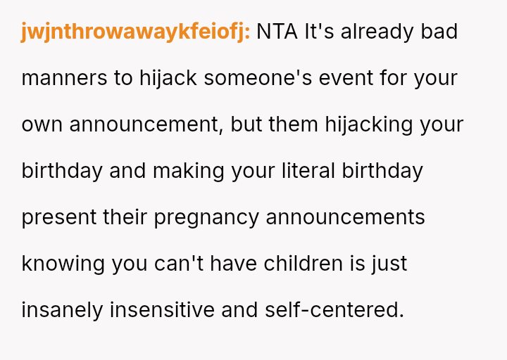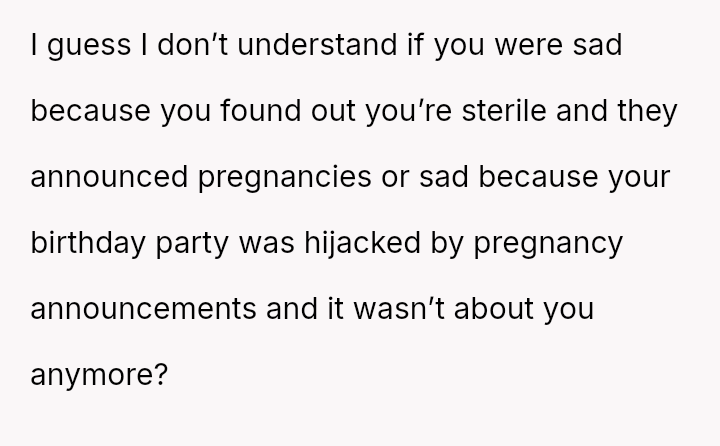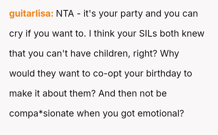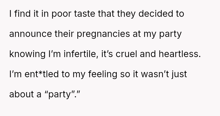 The original poster (OP) experienced significant emotional distress at her own birthday party when her sisters-in-law used the occasion to announce their pregnancies, seemingly ignoring the OP's known infertility and her request for a small, intimate gathering.