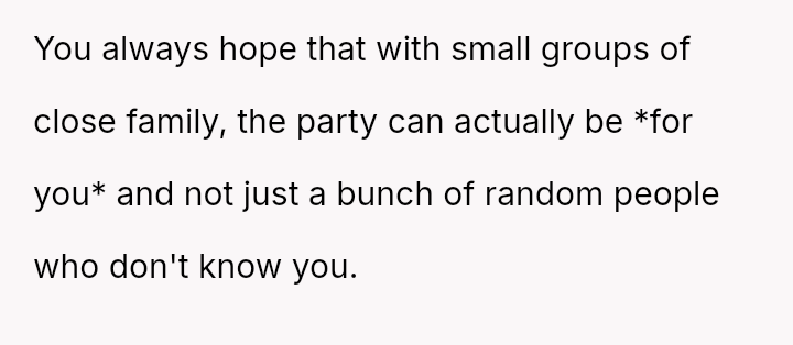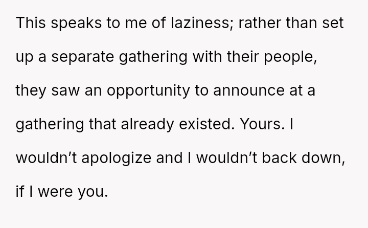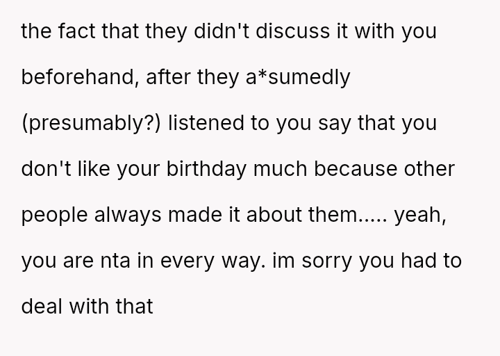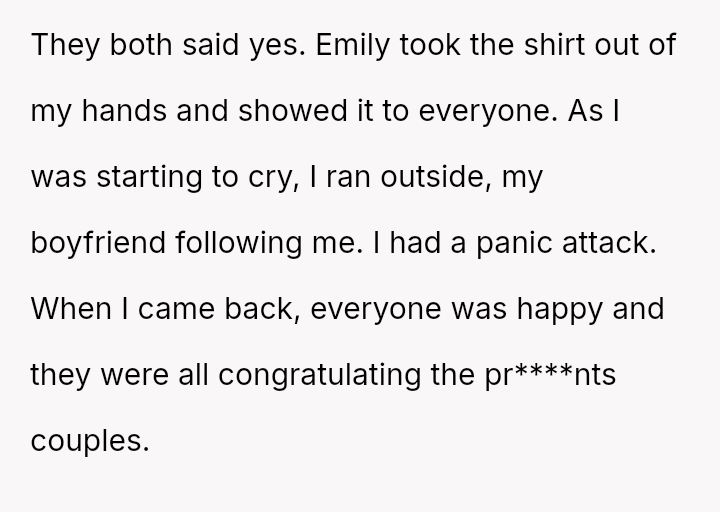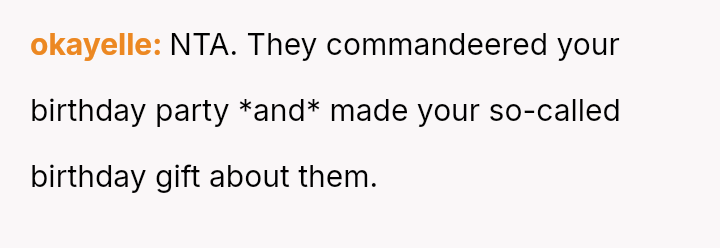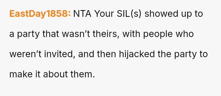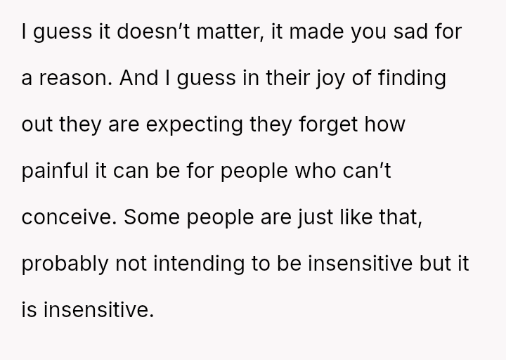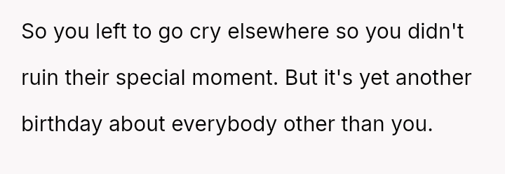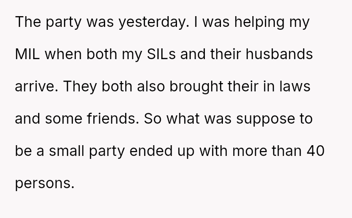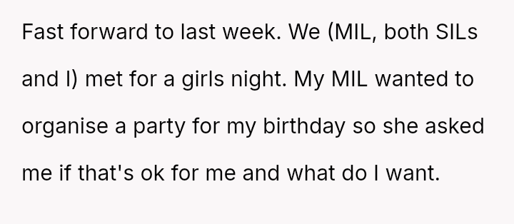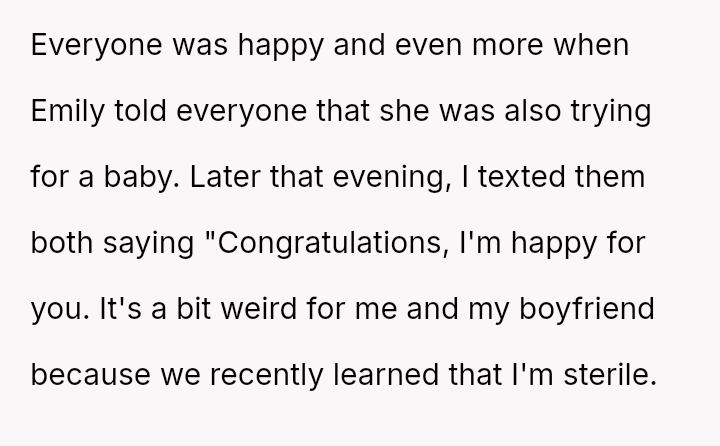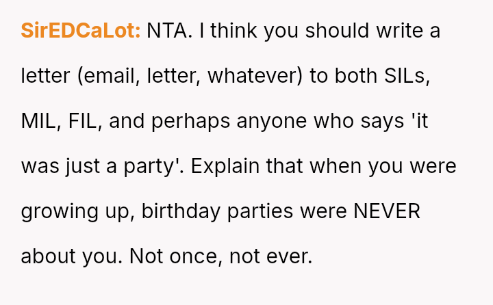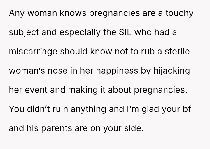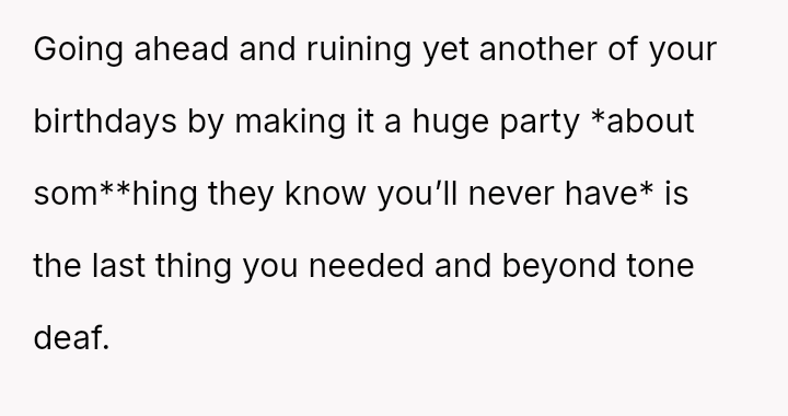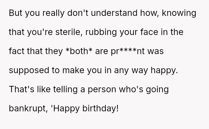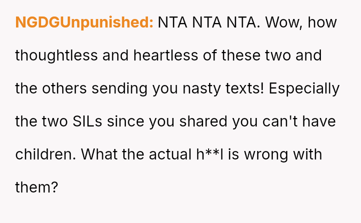 The original poster (OP) experienced significant emotional distress at her own birthday party when her sisters-in-law used the occasion to announce their pregnancies, seemingly ignoring the OP's known infertility and her request for a small, intimate gathering.