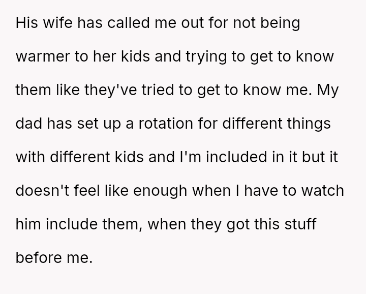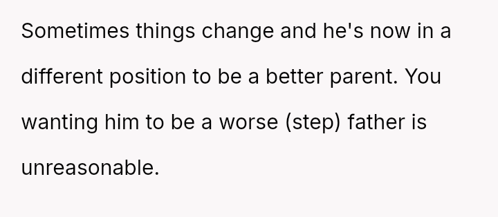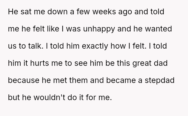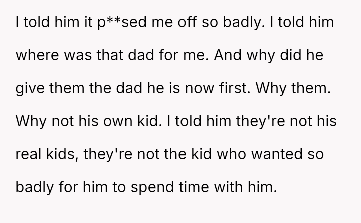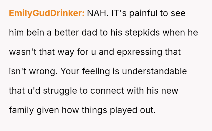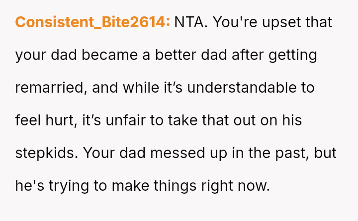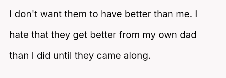 The central conflict lies in the OP's inability to accept their father's current attention and effort because it was not given to them first, leading to resentment toward the new stepfamily who now benefit from the father's best version.