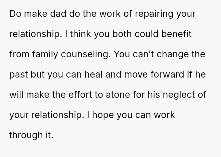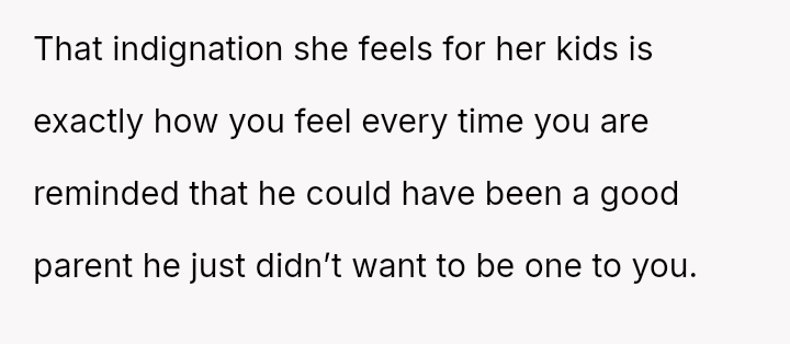 The original poster (OP) is struggling with intense feelings of anger and sadness stemming from years of feeling neglected by their father, especially in light of his significant positive change after remarrying.