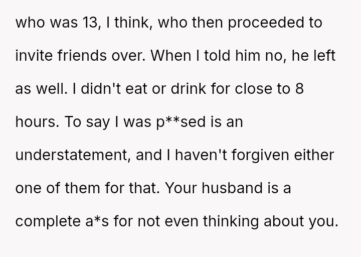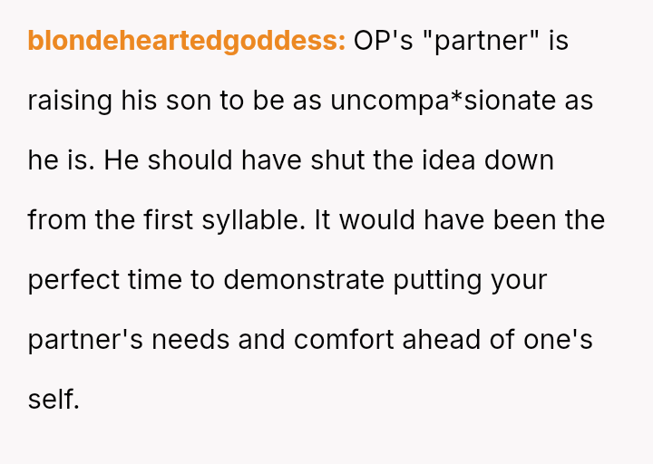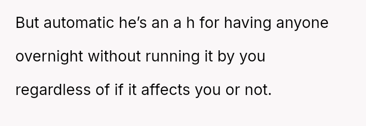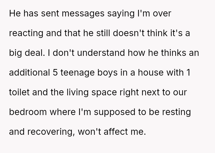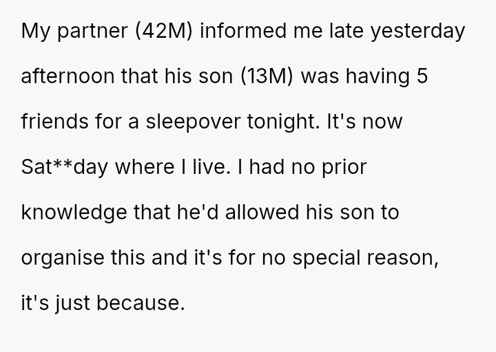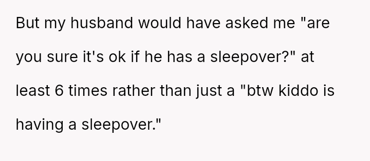 Her partner's casual dismissal of her needs, as he allows a chaotic sleepover without consulting her, leaves her feeling invisible and uncared for in a moment when she most needs support and understanding.