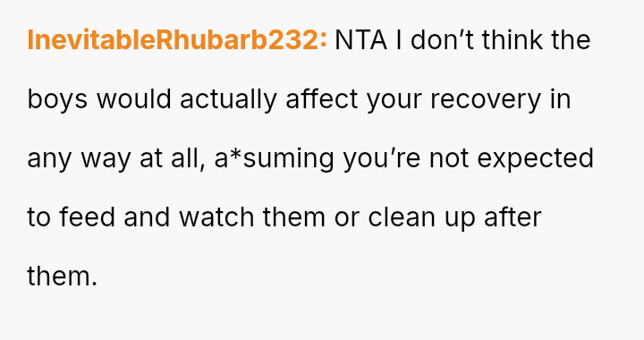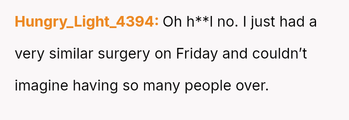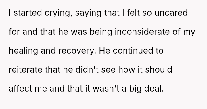 The central conflict lies between the OP's fundamental need for rest, privacy, and consideration during a critical recovery period, and her partner's dismissal of these needs, framing them as an overreaction to a minor inconvenience.