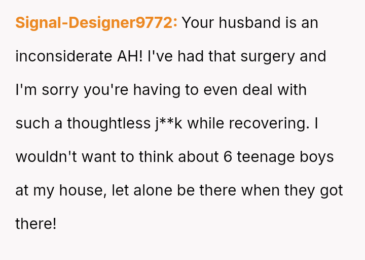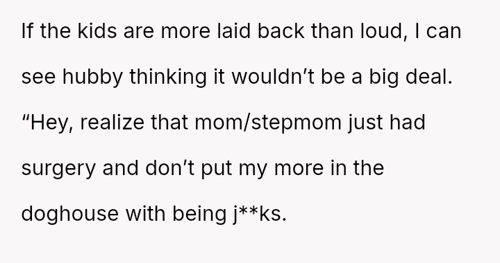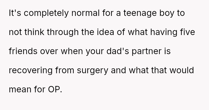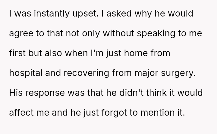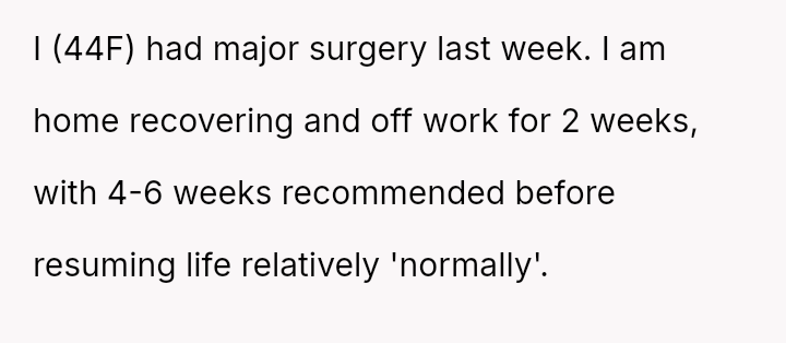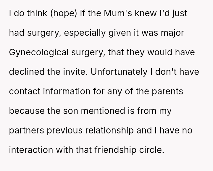 The original poster (OP) experienced significant distress and a sense of being uncared for after her partner unilaterally scheduled a major sleepover for his son immediately following her major gynecological surgery.