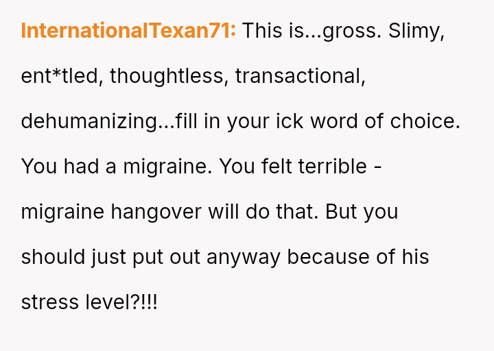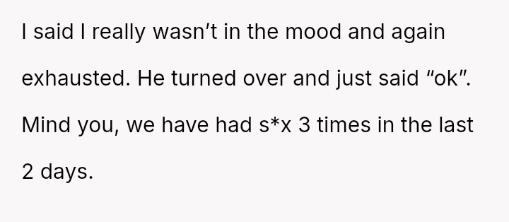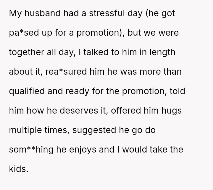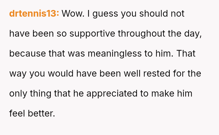 The original poster (OP) provided substantial emotional support and practical accommodation for her husband's stressful professional disappointment throughout the day, yet faced pressure to provide physical intimacy when she was physically depleted.