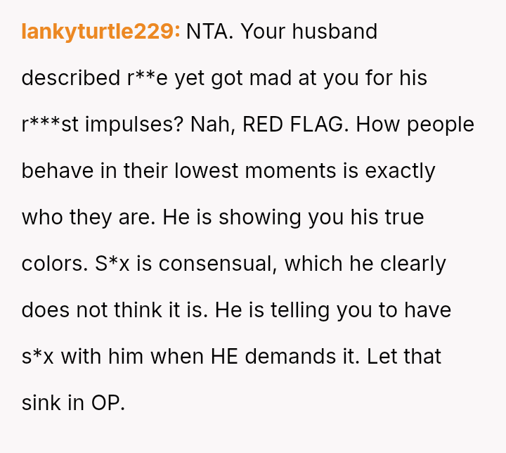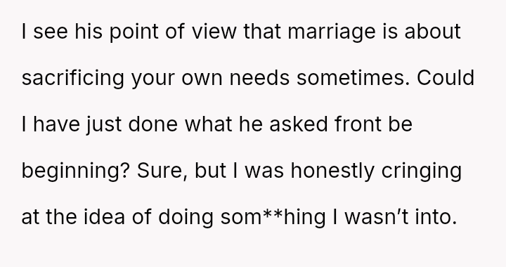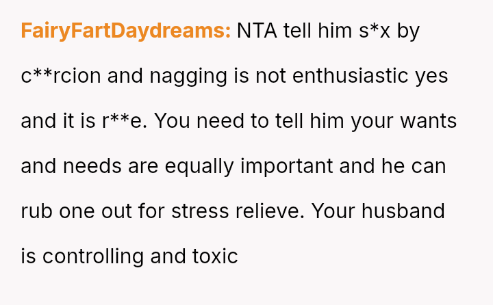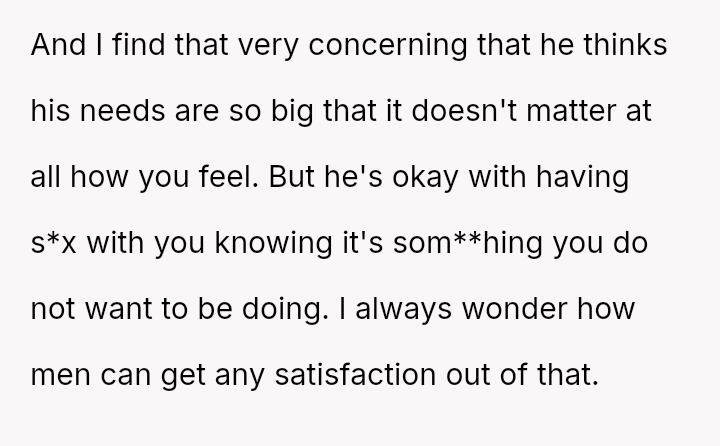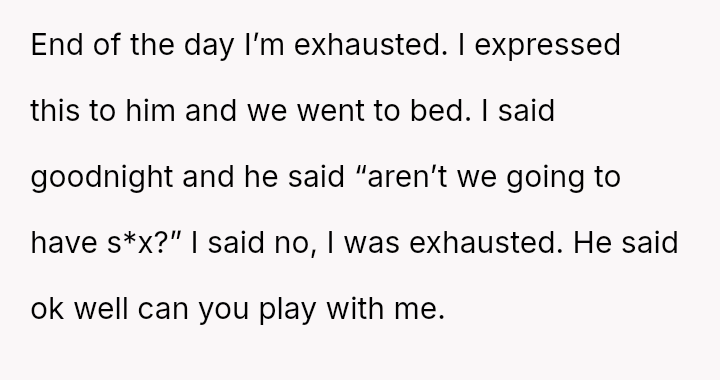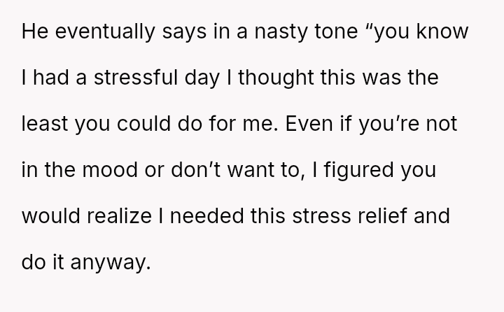 When a spouse feels ent*tled to s*xual intimacy as compensation for a difficult day, overriding their partner's stated exhaustion, where should the balance lie between marital duty and individual physical autonomy, even within a s*xually active relationship?