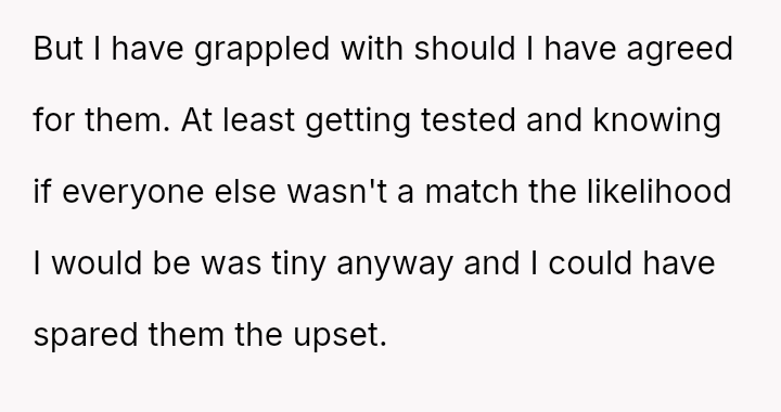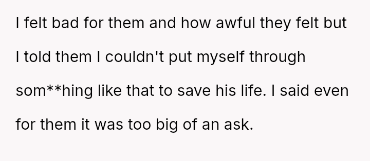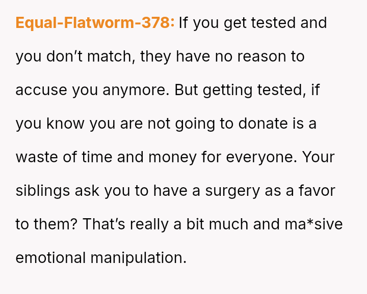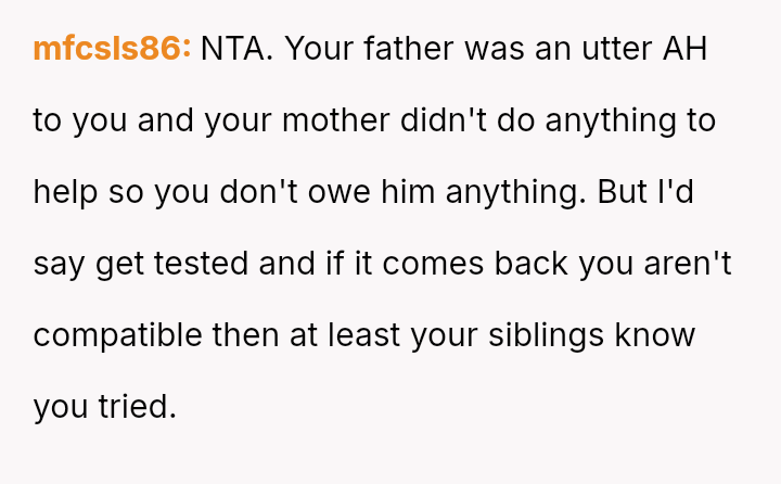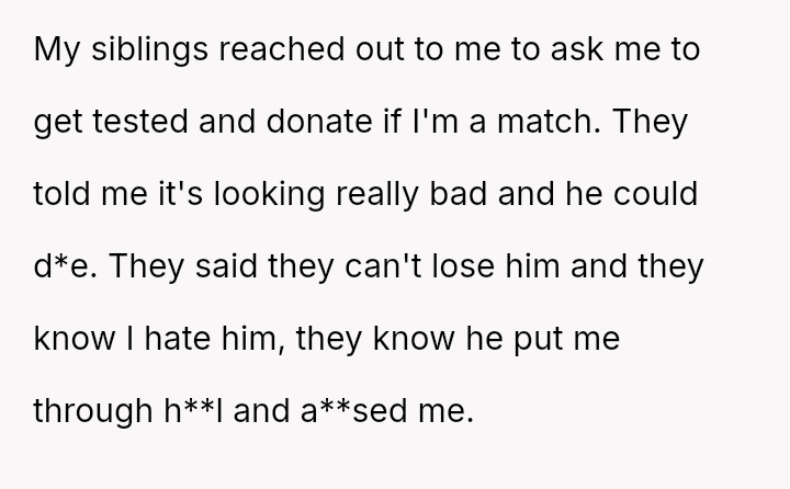 Given the severe, lifelong a**se inflicted by the father, is the OP morally obligated, even implicitly, to undergo medical testing for a transplant to satisfy the emotional needs of their siblings, or does the right to self-preservation and freedom from past a**sers supersede all familial obligation in this medical context?