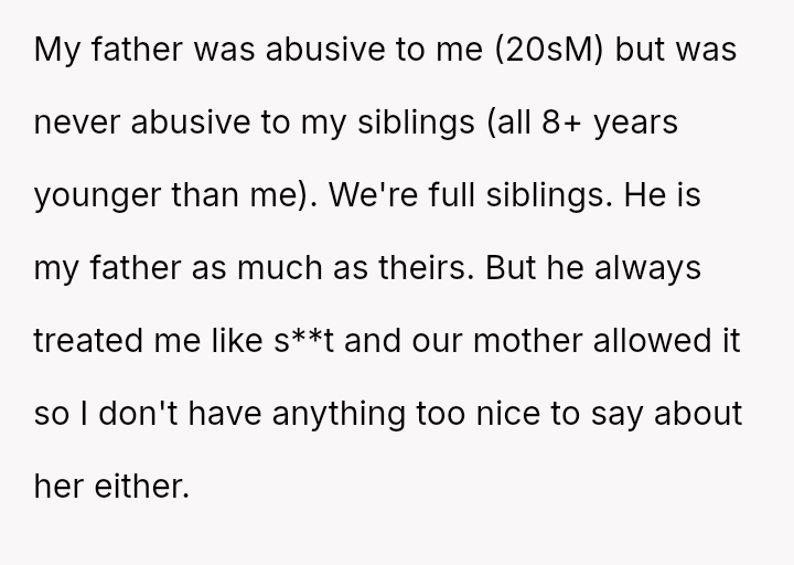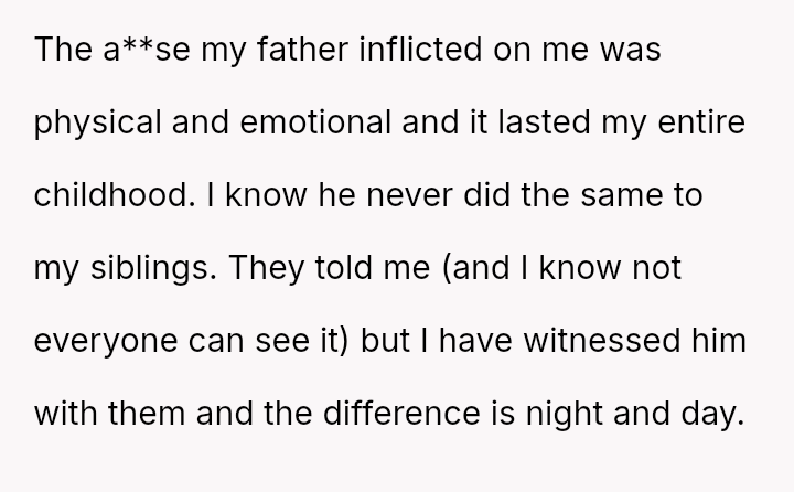 He carries the weight of a childhood marred by cruelty, a relentless storm of a**se that his siblings never had to face.
