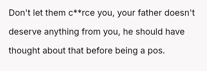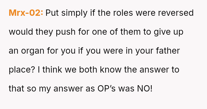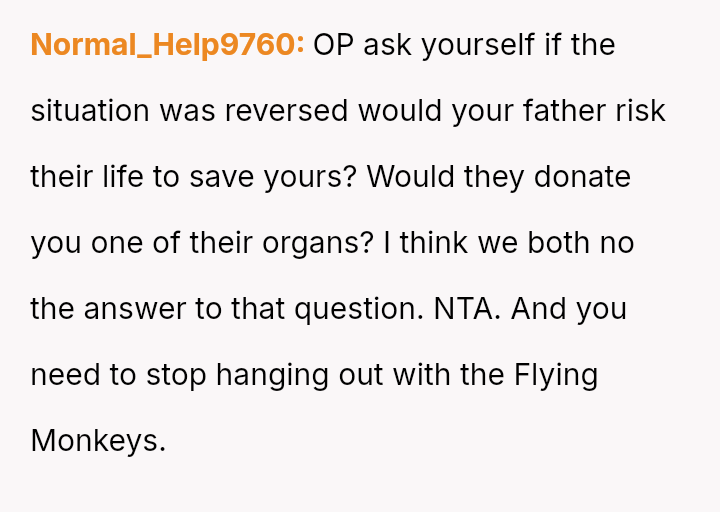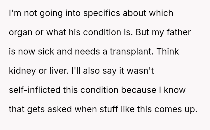 The original poster (OP) faces a profound ethical dilemma rooted in past trauma: whether to potentially save the life of an abusive father by donating an organ, primarily to ease the emotional burden on their younger, non-a**sed siblings.
