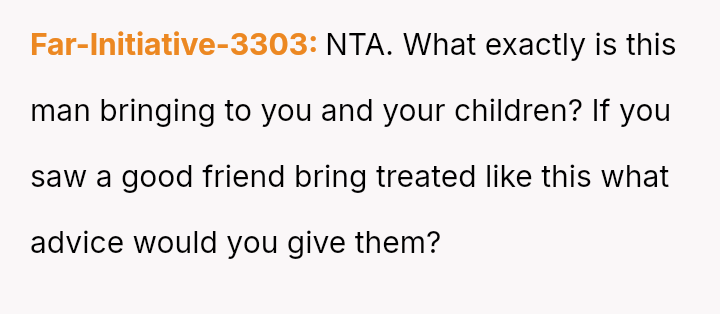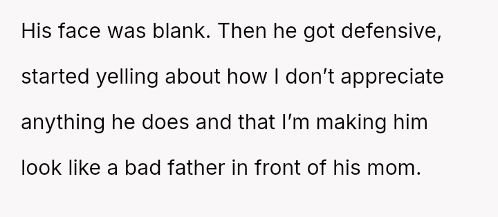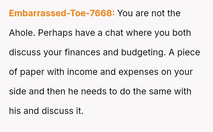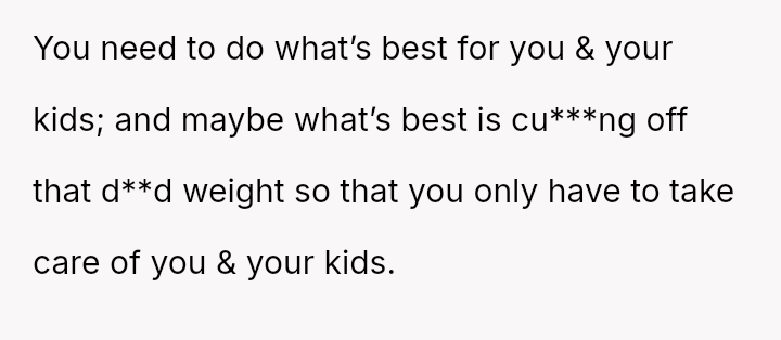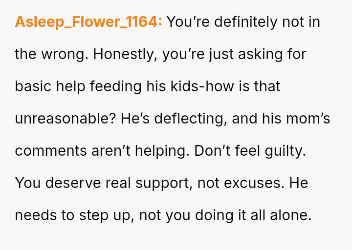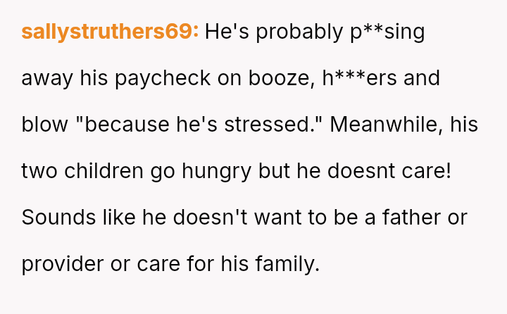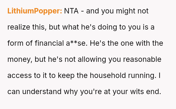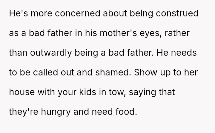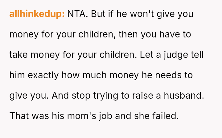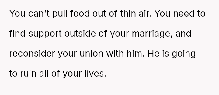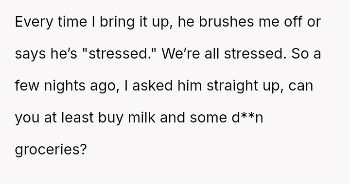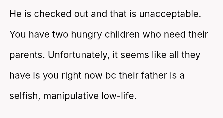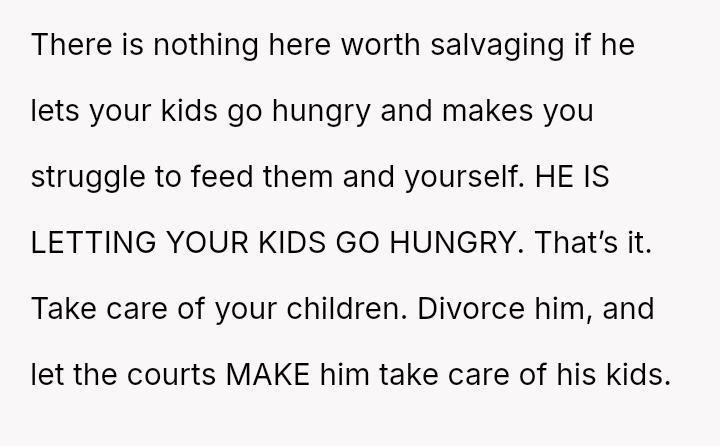 Given the essential nature of providing food for dependent children, was the OP justified in confronting her husband directly about his refusal to contribute financially, or did her chosen m**hod of confrontation create an unproductive impa*se?