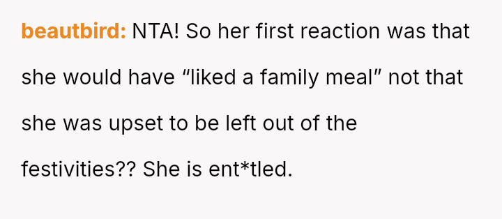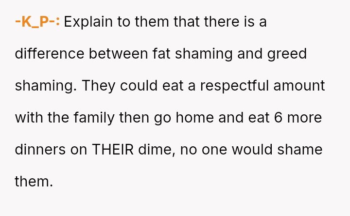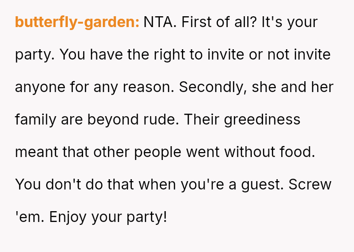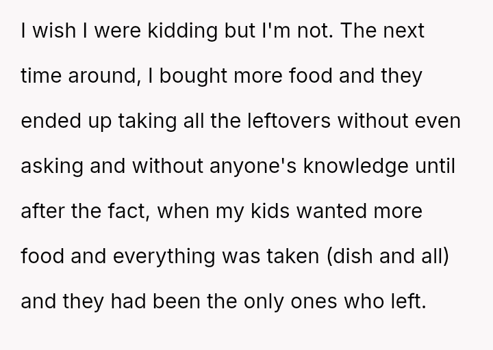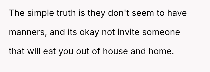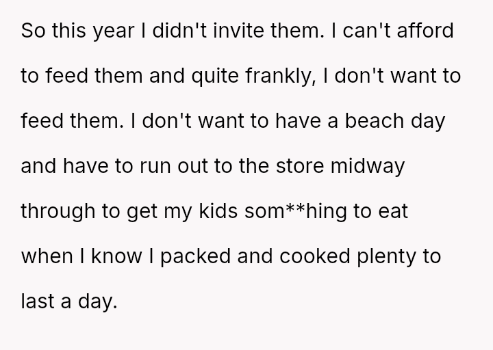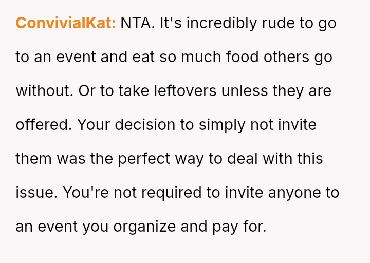 The original poster (OP) experienced significant financial and logistical stress due to their in-laws' excessive food consumption at family gatherings, leading them to exclude the in-laws from this year's event.