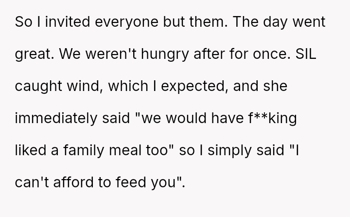 Was the OP justified in excluding their in-laws to protect their budget and ensure adequate food for their immediate family, or did this action cross a line into unnecessary social shaming and alienating family members?