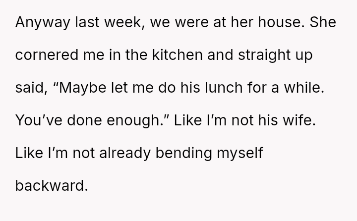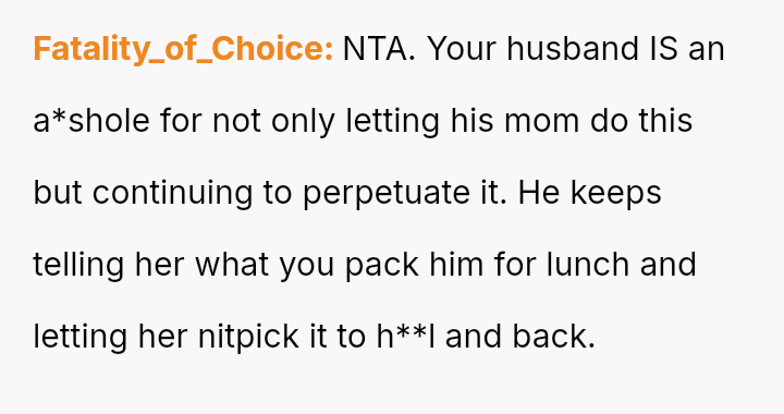 The original poster (OP) felt emotionally exhausted and undermined by her mother-in-law's constant criticism regarding a simple act of care—packing her husband's lunch.