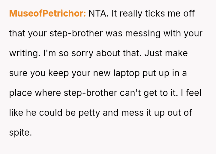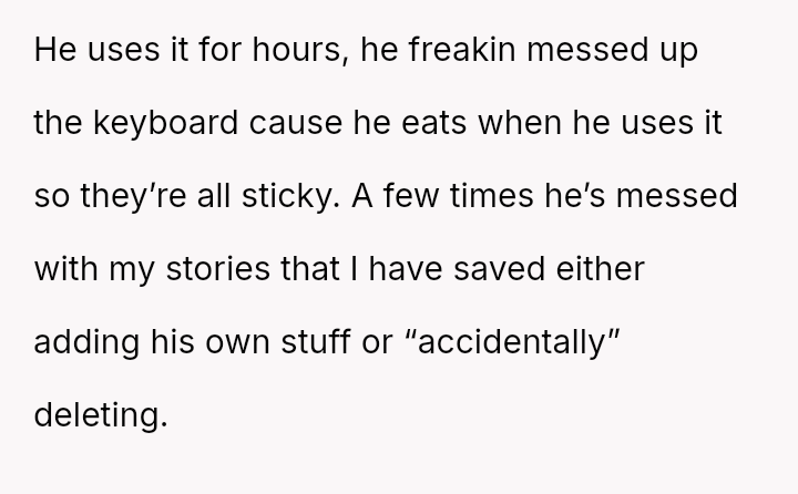 His stepbrother’s careless use and interference with his work chips away at not just the keyboard, but the boy’s sense of respect and personal space, leaving him feeling unheard and undervalued by the one person who was supposed to protect him.