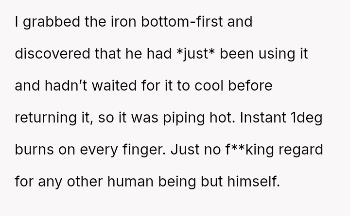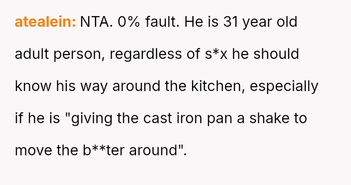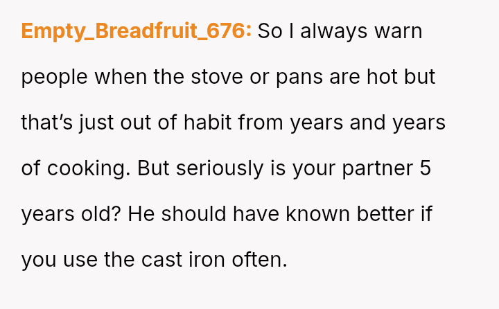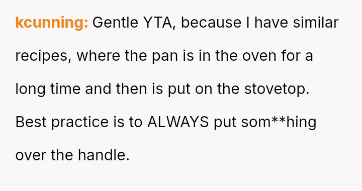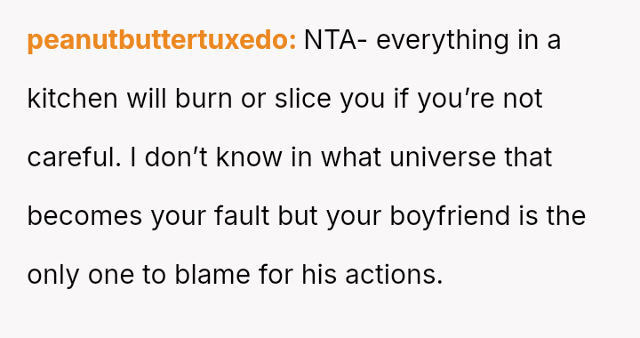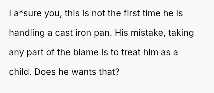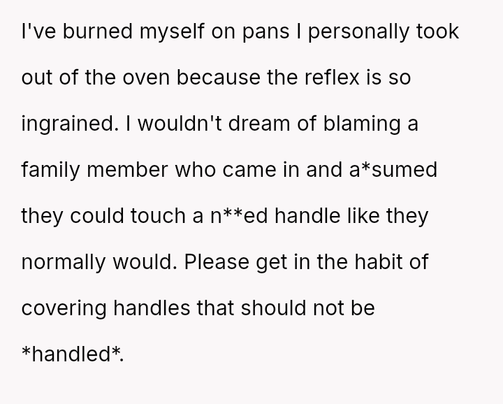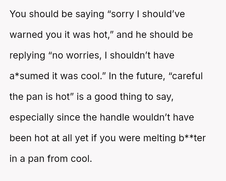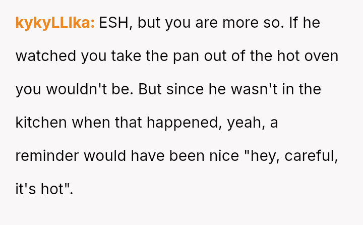 The original poster (OP) is facing a conflict where a minor kitchen accident involving a hot pan has escalated into a disagreement over responsibility.