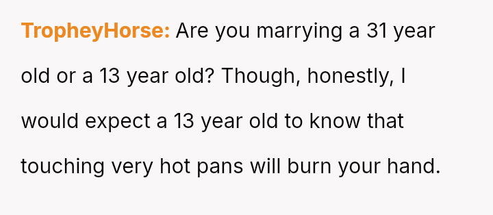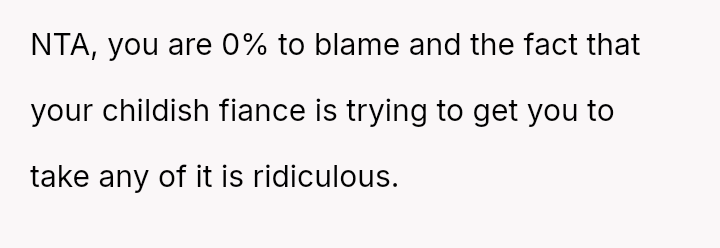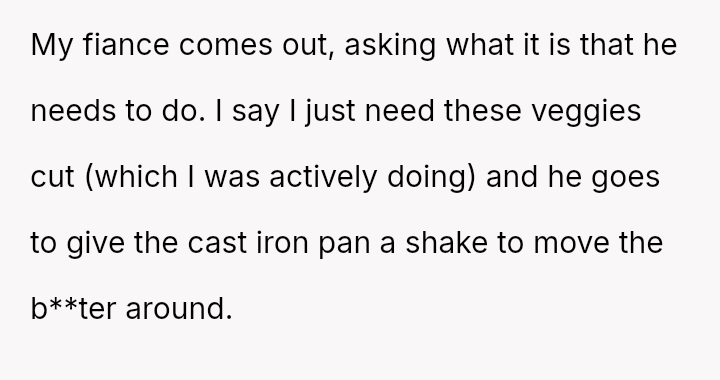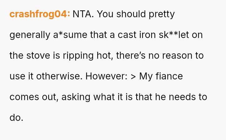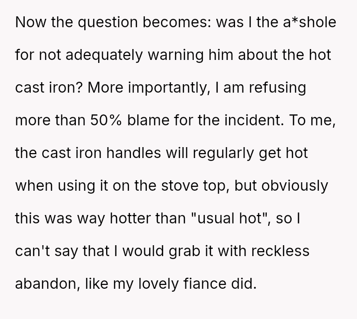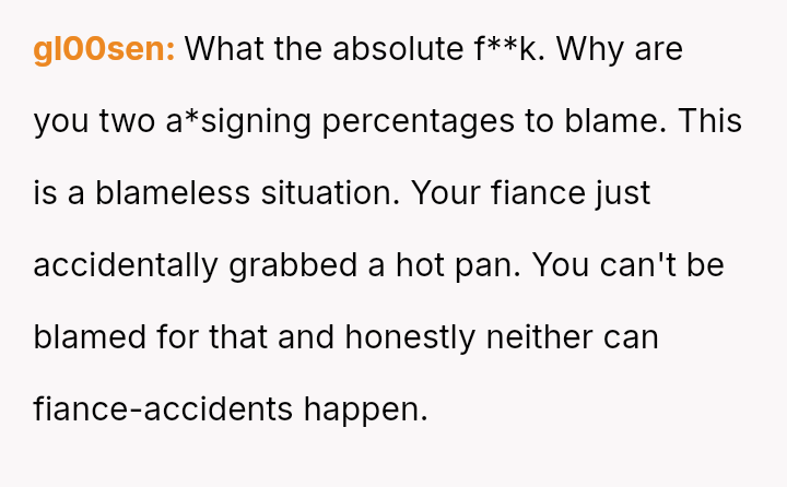 The OP feels they are not at fault because the pan was unusually hot, and they were focused on another task, while the fiancé insists the OP should bear the majority of the blame for not issuing an explicit warning.