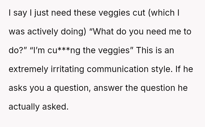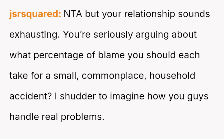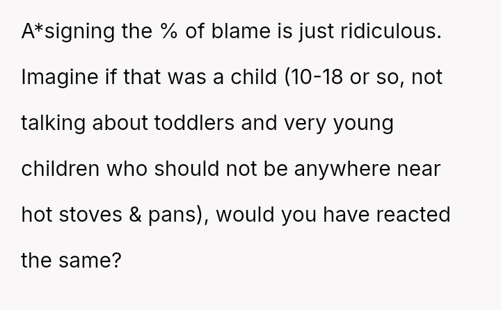 Given the dispute centers on the division of responsibility in a shared space after a sudden injury, should the focus remain on a*signing a precise percentage of blame for the burn, or should the couple prioritize immediate conflict resolution and es**blishing clearer safety protocols for future shared kitchen use?