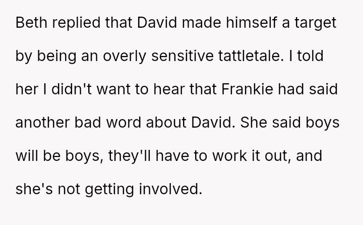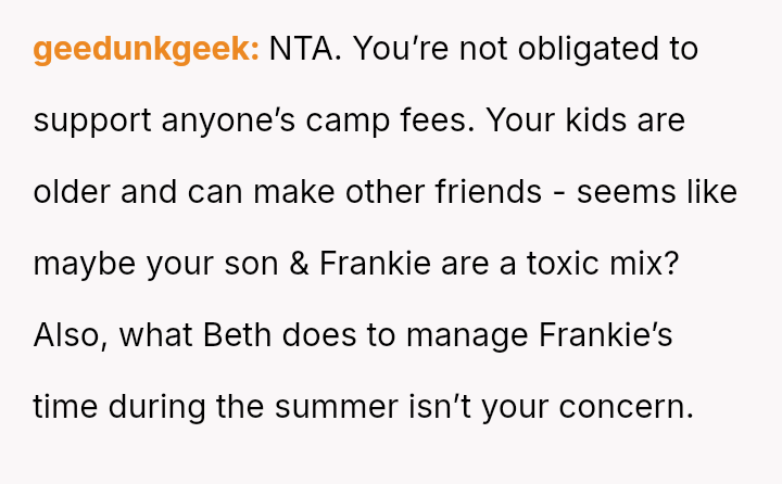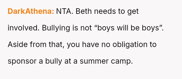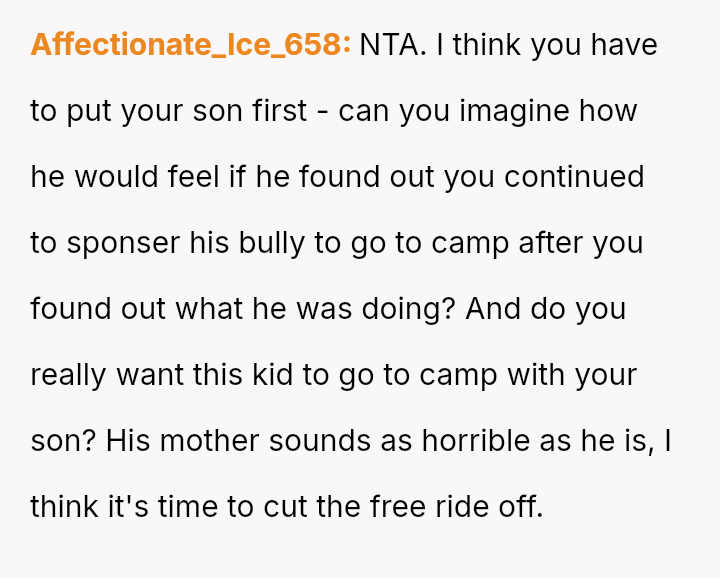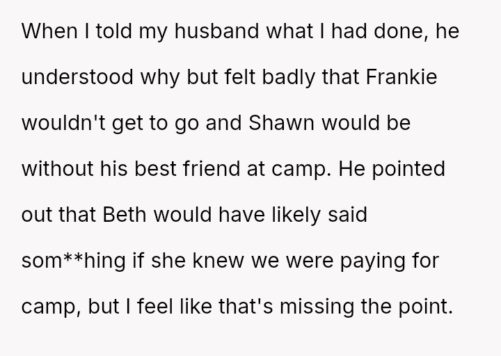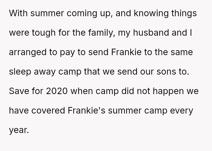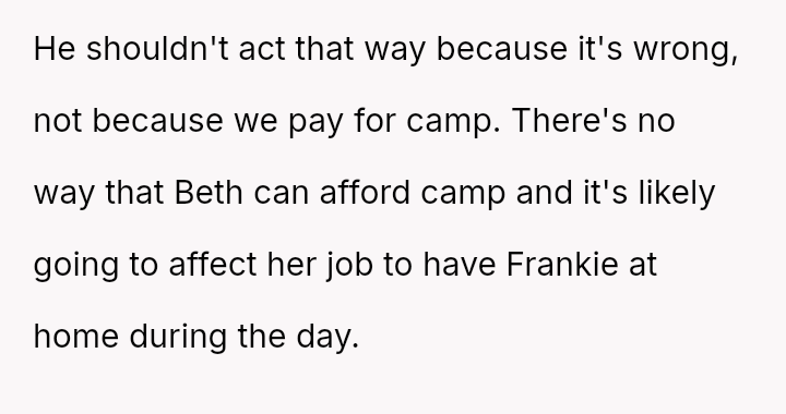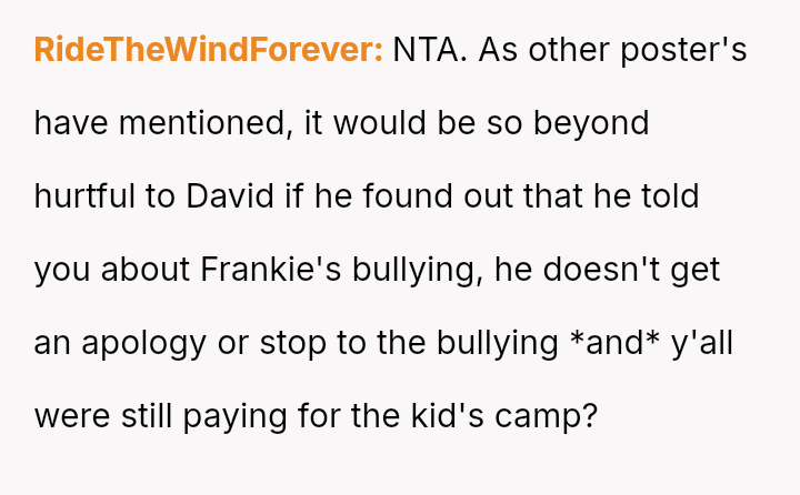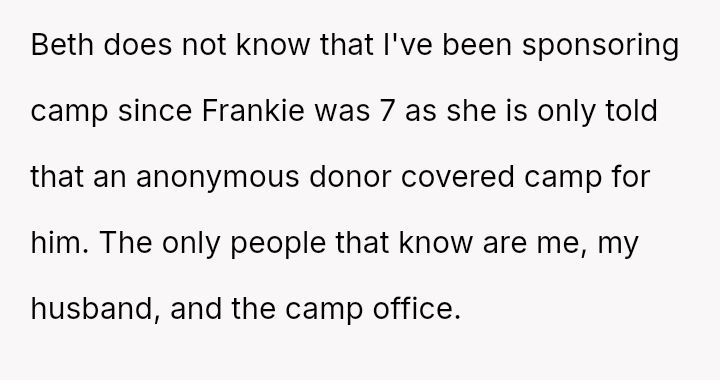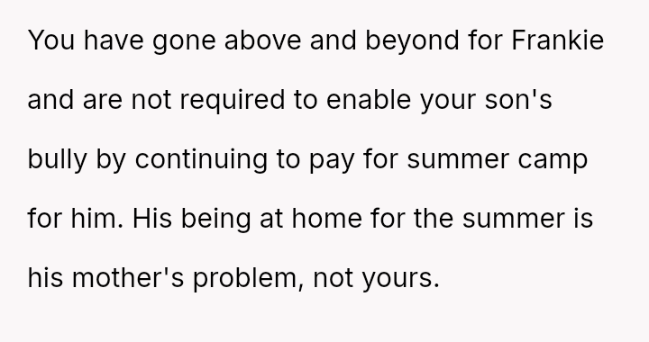 Given that the OP prioritized their older son's safety and emotional well-being over a long-standing act of charity, the central question remains: Was withdrawing financial support for Frankie's camp tuition a justifiable and necessary response to protect David, or did it const*tute an overreaction that unfairly punished Frankie and placed undue stress on Beth, regardless of Frankie's unacceptable behavior?