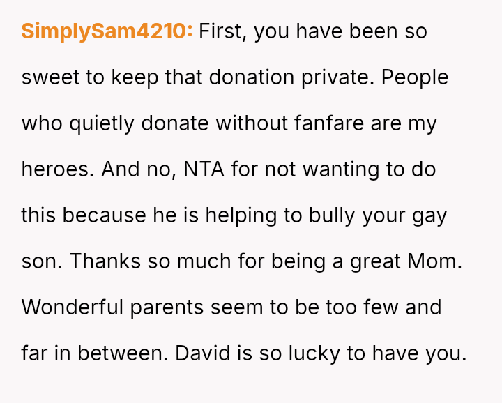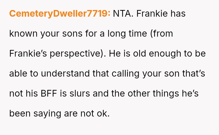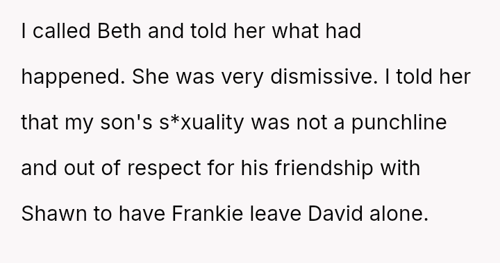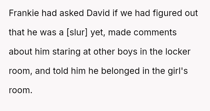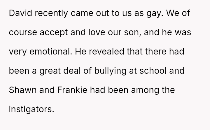The original poster (OP) is facing a difficult conflict stemming from their need to protect their recently outed son, David, from severe bullying perpetrated by their younger son's best friend, Frankie.