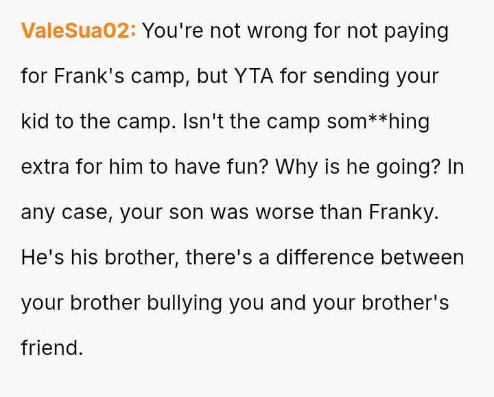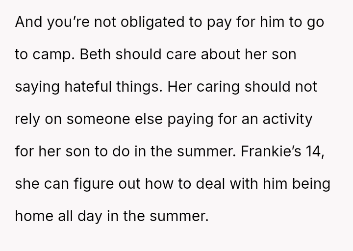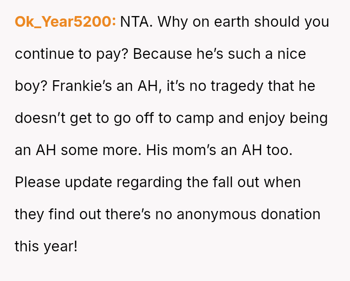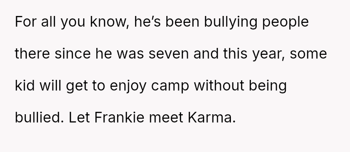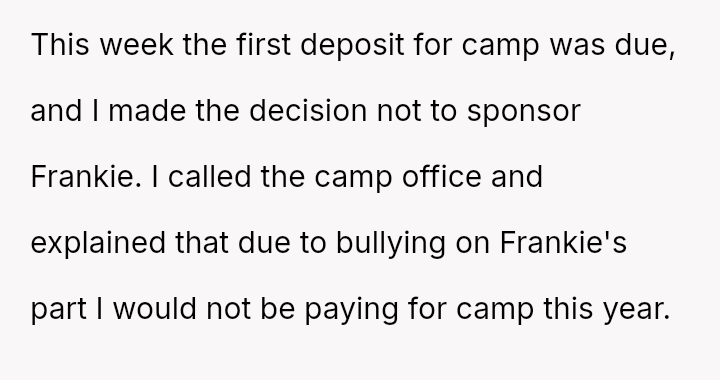The OP acted decisively by withdrawing financial support for Frankie's camp tuition, aligning their actions with their belief that Frankie’s harmful behavior should have consequences.