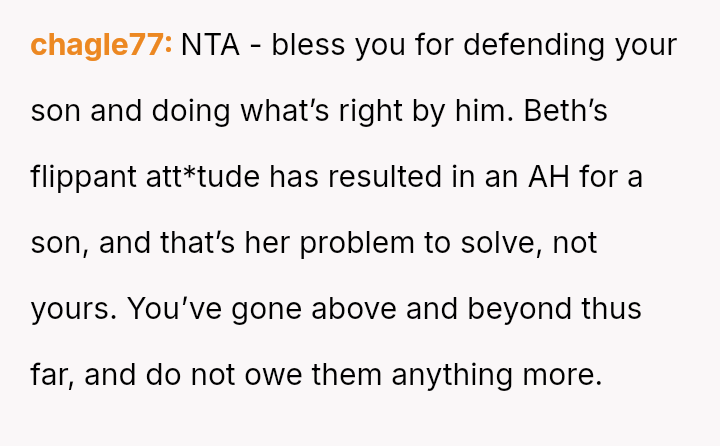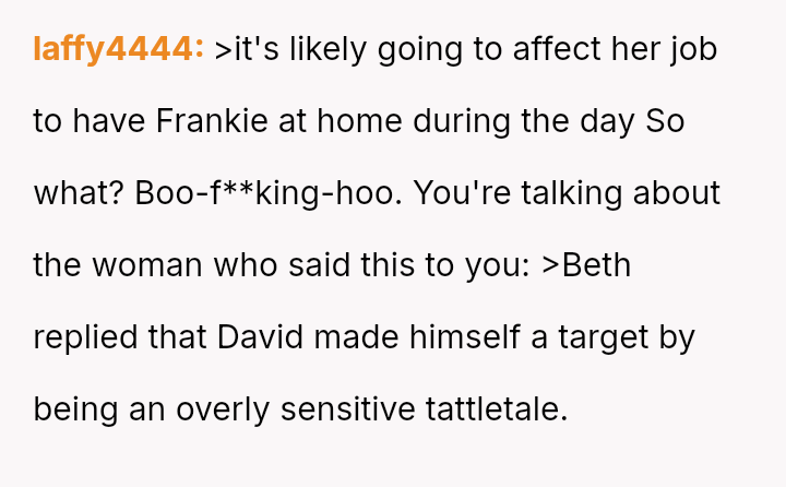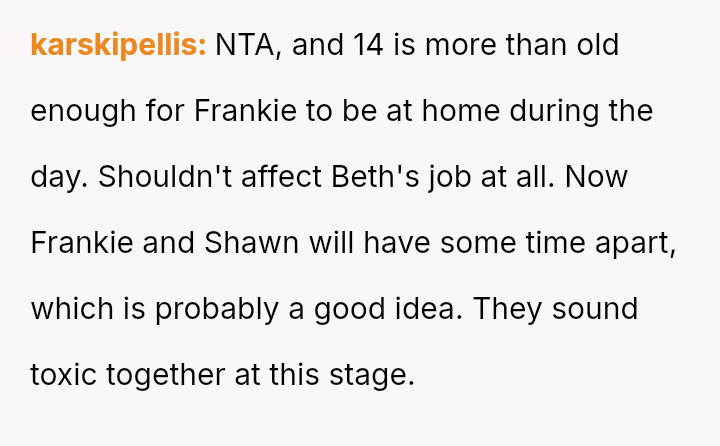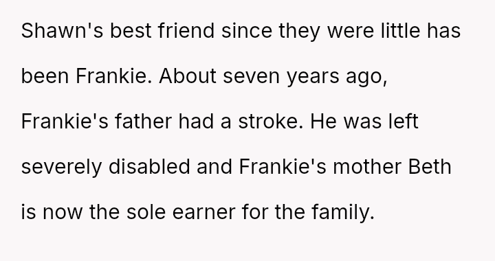 However, this decision creates guilt because it negatively impacts Frankie, his struggling single mother, Beth, and potentially strains the relationship between the OP's sons, Shawn and Frankie.