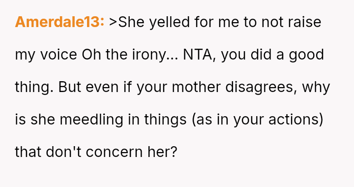 This intervention directly conflicted with the mother's expectation that the OP should remain uninvolved in the affairs of strangers.