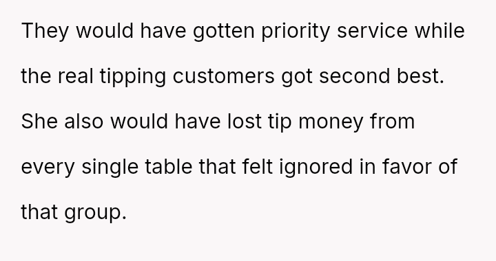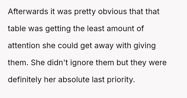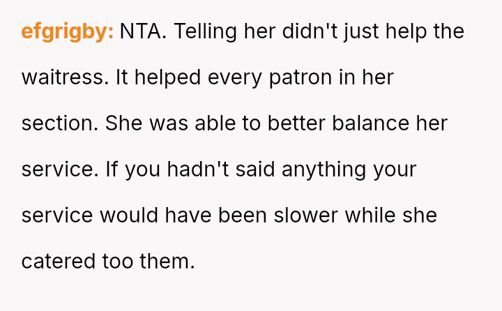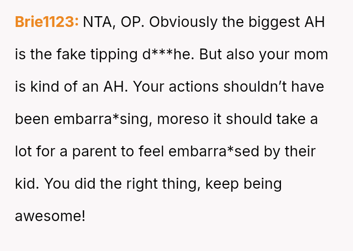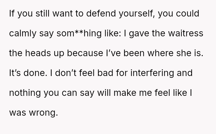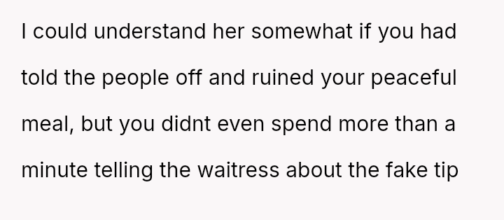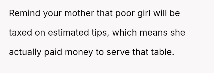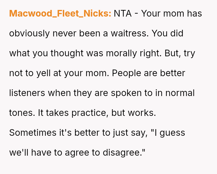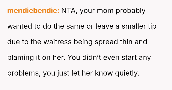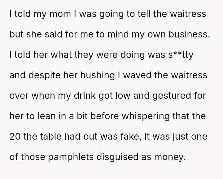 Was the OP correct to prioritize the waitress's well-being by exposing the deceptive action, even if it meant causing a scene and arguing with their mother, or should the OP have followed the advice to mind their own business, prioritizing social harmony over correcting a perceived injustice?