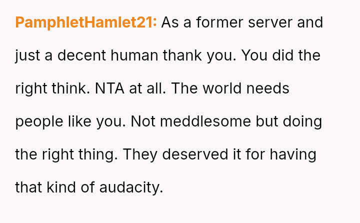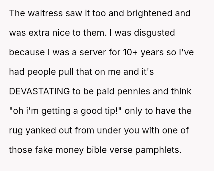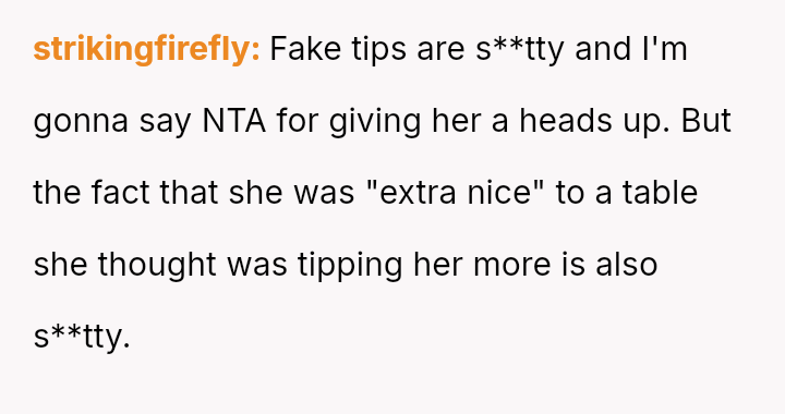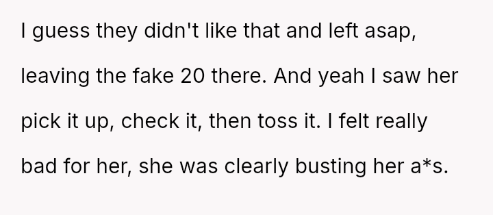The original poster (OP) acted based on strong empathy derived from past negative experiences as a server, leading them to intervene when they saw a customer attempting to deceive the waitress with a fake tip disguised as money.