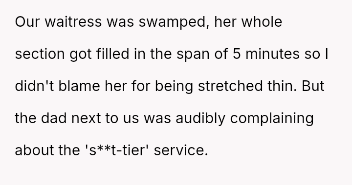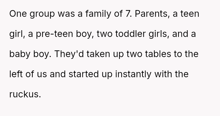 But their evening was quickly overshadowed by chaos and discomfort, as a nearby family's unruly behavior and a father's harsh complaints disrupted the fragile peace, igniting an unexpected moral dilemma.